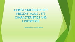 Net present value (NPV) is used to analyze the profitability of investments by discounting future cash flows to their present value and comparing them to the initial investment amount. A positive NPV means the investment increases firm value and is acceptable, while a negative NPV means it decreases firm value and is unacceptable. To calculate NPV, an analyst estimates future cash flows, the required return, the timing of cash flows, and discounts the cash flows to find their present value minus the initial investment. NPV considers the time value of money and all cash inflows to determine if an investment maximizes firm value and owner welfare. However, NPV is limited by the accuracy of estimating future cash flows and discount rates, does not