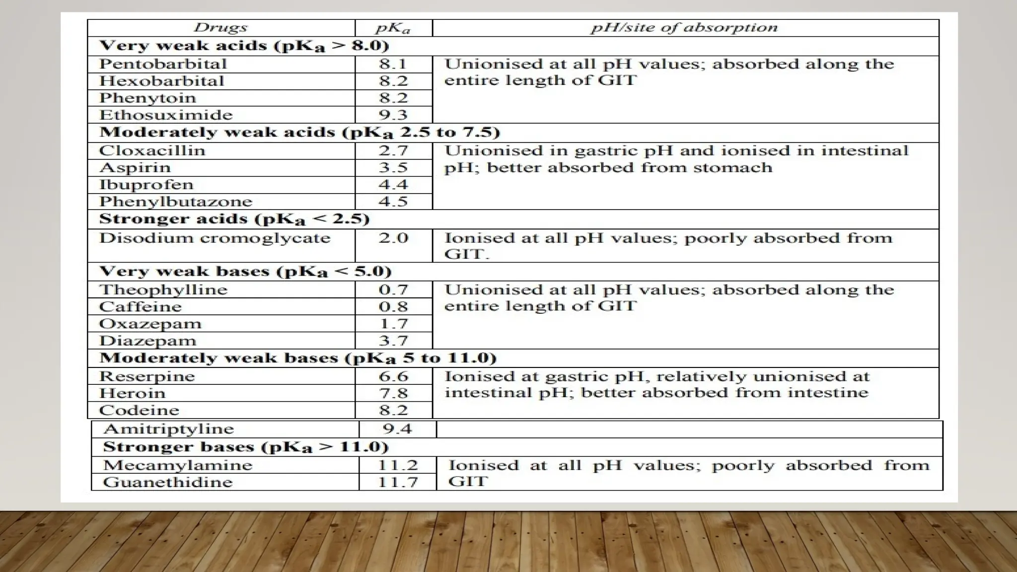 • 2. Larger the fraction of unionised drug, faster the absorption.