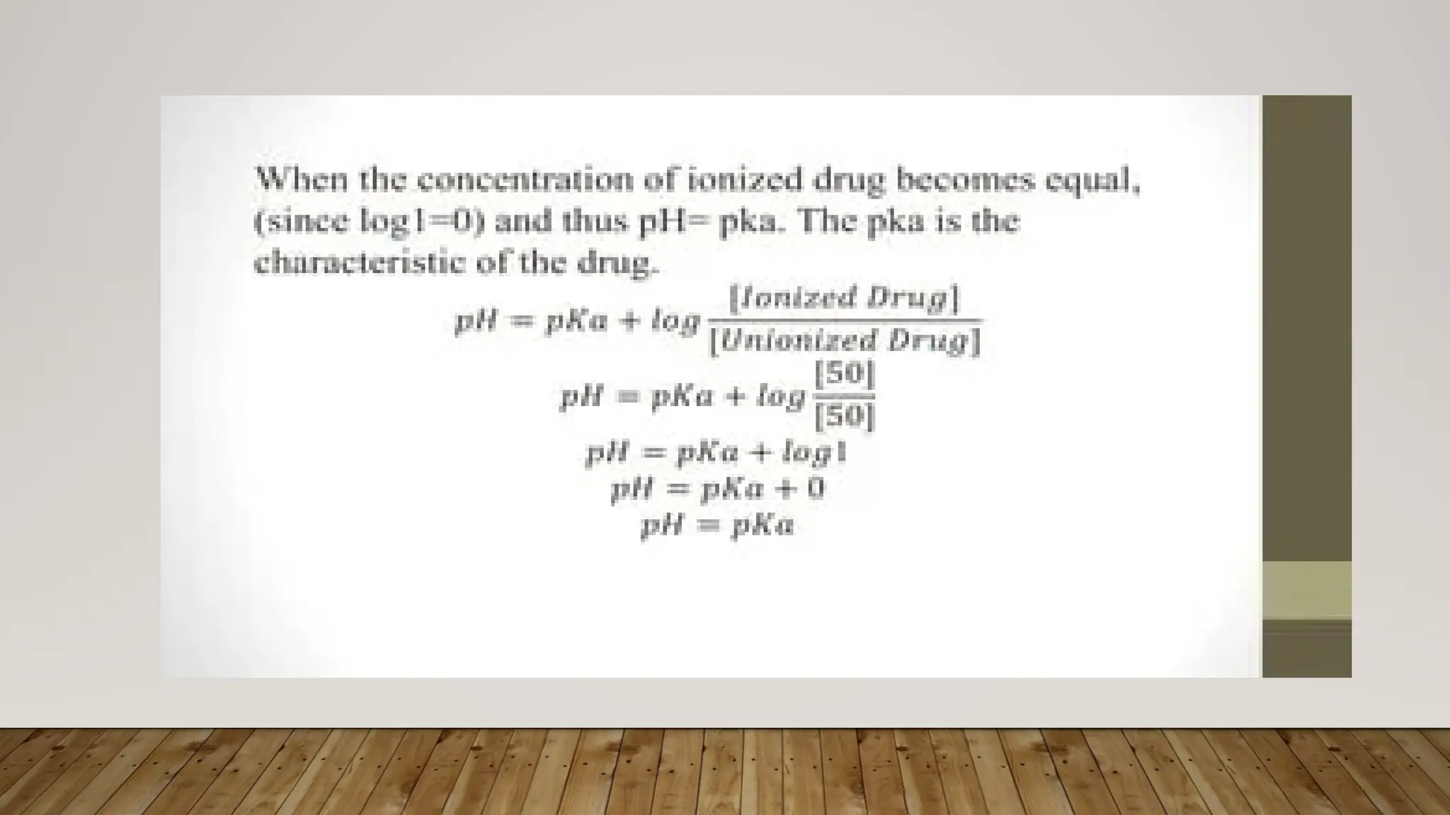 • The relative amount of ionised and unionised drug in solution at a particular PH can