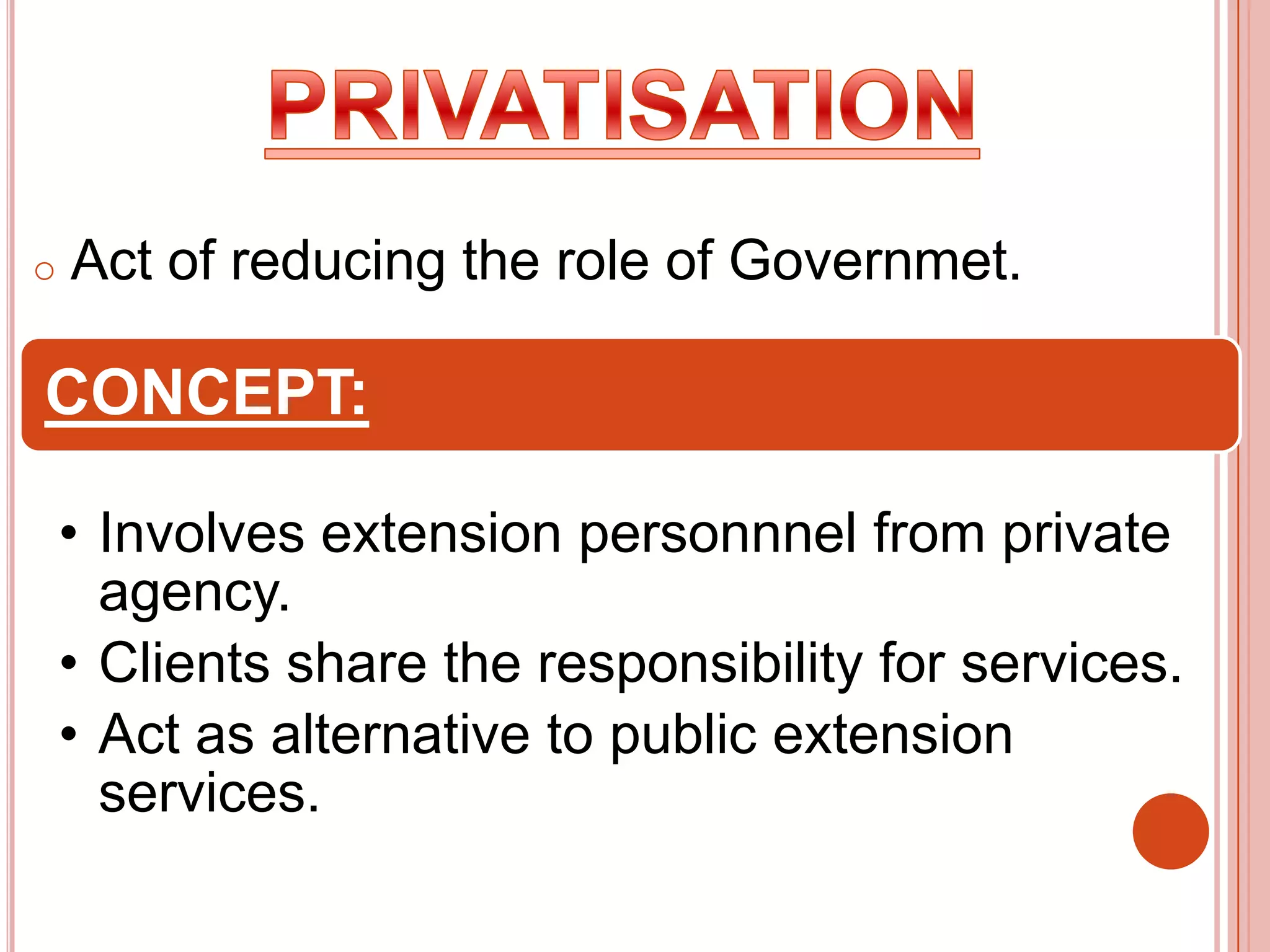 This document discusses private extension services as an alternative to public extension. It defines private extension as involving personnel from private agencies with clients sharing responsibility. The objectives of private extension are to maximize profit and increase farmer income through advisory services. Some successful private extension examples mentioned are Tata Kisan Sansar, ITC's e-Chaupal, and Mahindra Shubh Labh Company. The document also outlines approaches, providers, merits like timely inputs and market information, and demerits such as excludable information and increased farmer dependence of private extension.