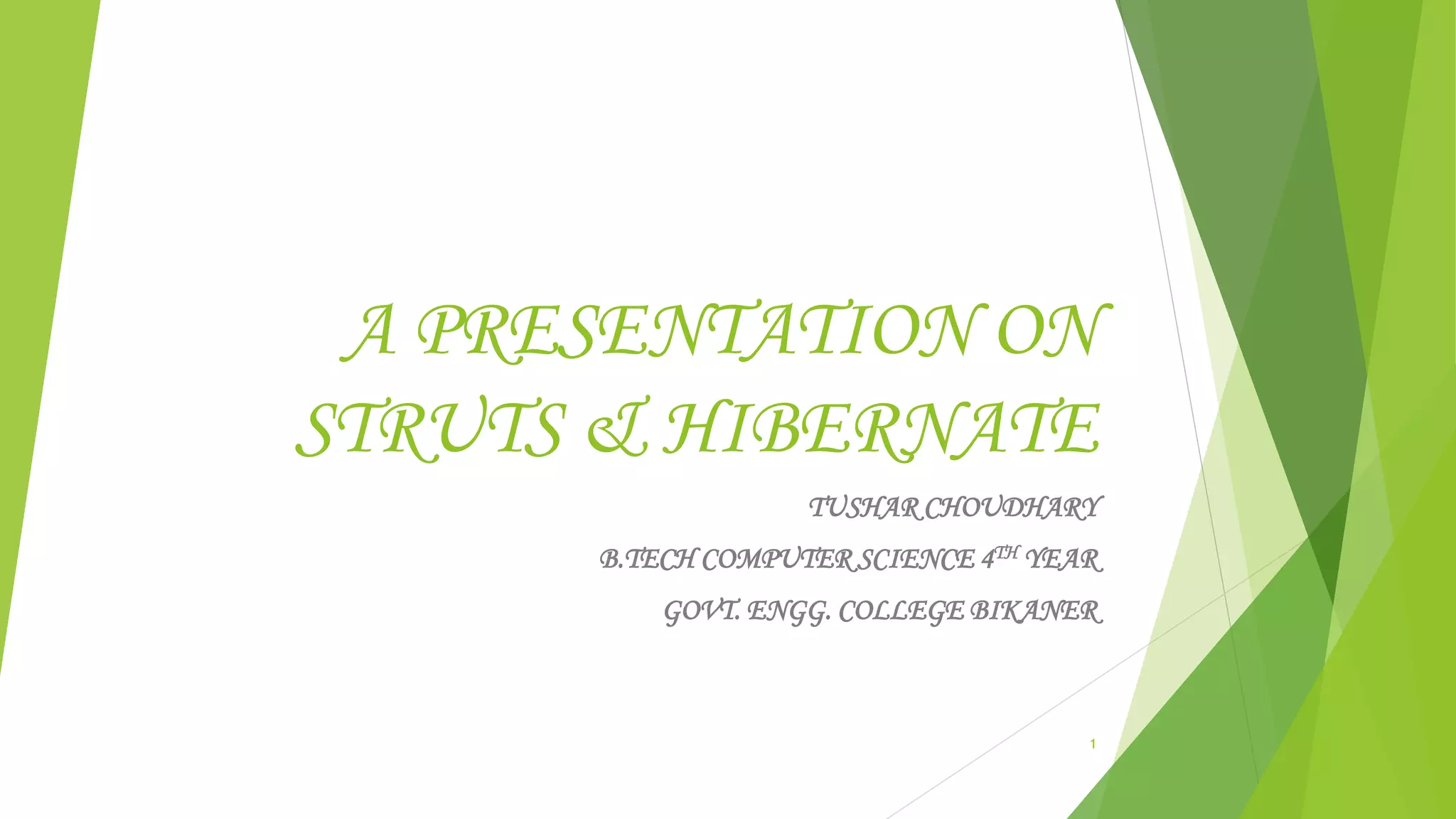 The presentation discusses the Struts 2 framework, which is an MVC-based web application development framework initially created in 2000, highlighting its features such as POJO-based actions and AJAX support, and detailing the steps to create a Struts 2 application. Additionally, it covers Hibernate, an ORM tool started in 2001 by Gavin King for simplifying database interactions in Java applications, its advantages, architecture, and steps to create a Hibernate application. References for further reading are provided at the end of the document.