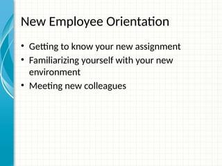 The document is a presentation designed for new employee orientation, focusing on familiarizing new hires with their assignment, environment, and colleagues. It outlines learning objectives related to technology, procedures, and policies, and includes a case study on common challenges faced by new employees. The session emphasizes the importance of mentorship, setting realistic expectations, and continuous achievement towards mastery.