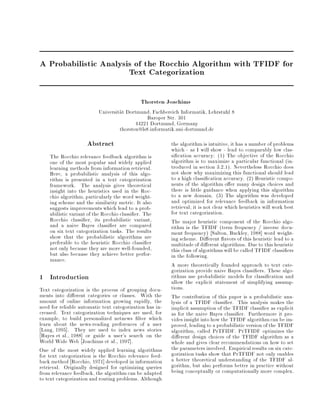 This document presents a probabilistic analysis of the Rocchio algorithm, a popular text categorization method, and compares it to a naive Bayes classifier. The analysis provides theoretical insight into Rocchio's heuristics, especially its TFIDF word weighting scheme. It suggests improvements that lead to a probabilistic variant of Rocchio called PrTFIDF. An empirical comparison on six text categorization tasks shows that PrTFIDF and the naive Bayes classifier perform better than the heuristic Rocchio classifier in terms of classification accuracy.