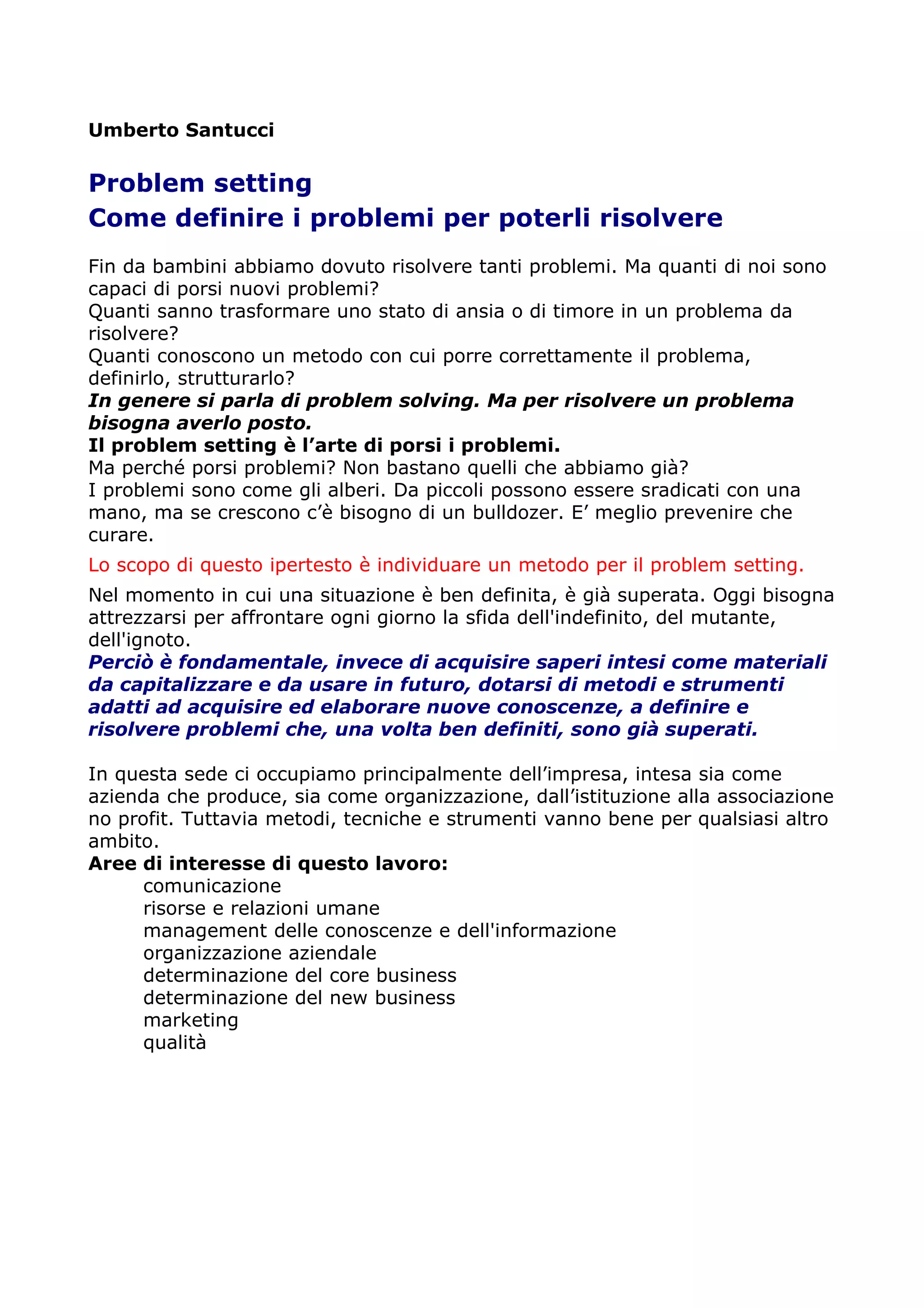 Il documento analizza il concetto di 'problem setting', evidenziando l'importanza di definire correttamente i problemi per poterli affrontare e risolvere efficacemente. Viene sottolineata la distinzione tra 'problem setting' e 'problem solving', dove il primo riguarda la formulazione del problema e il secondo la sua soluzione. Inoltre, si esplorano metodologie e strumenti utili per affrontare i problemi in contesti aziendali e organizzativi.