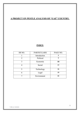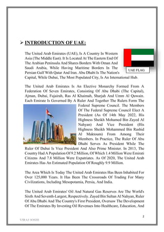 The document provides an overview of the United Arab Emirates (UAE). It discusses the UAE's history, government and politics, economy, and other topics. Key points include: