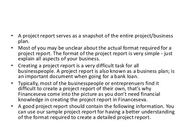 The document outlines the format and importance of a project report, which serves as a comprehensive business plan crucial for obtaining bank loans. It details the elements that should be included, such as project scope, promoter information, product/service descriptions, location, market strategy, and financial data. It also mentions that Financeseva can assist entrepreneurs in creating these reports without requiring extensive financial knowledge.