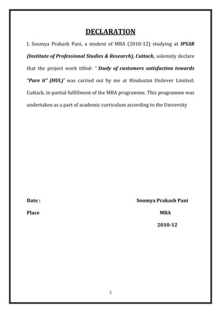 The document is a project report submitted by Soumya Prakash Pani to the Biju Pattnaik University of Technology for their MBA degree. The report studies customer satisfaction towards HUL's water purifier brand "Pure it" in Cuttack city, India. It includes declarations, acknowledgements of those who assisted with the project, and an outline of the report contents which covers topics like the company and product profile, data collection methodology used, findings of the study, and recommendations.