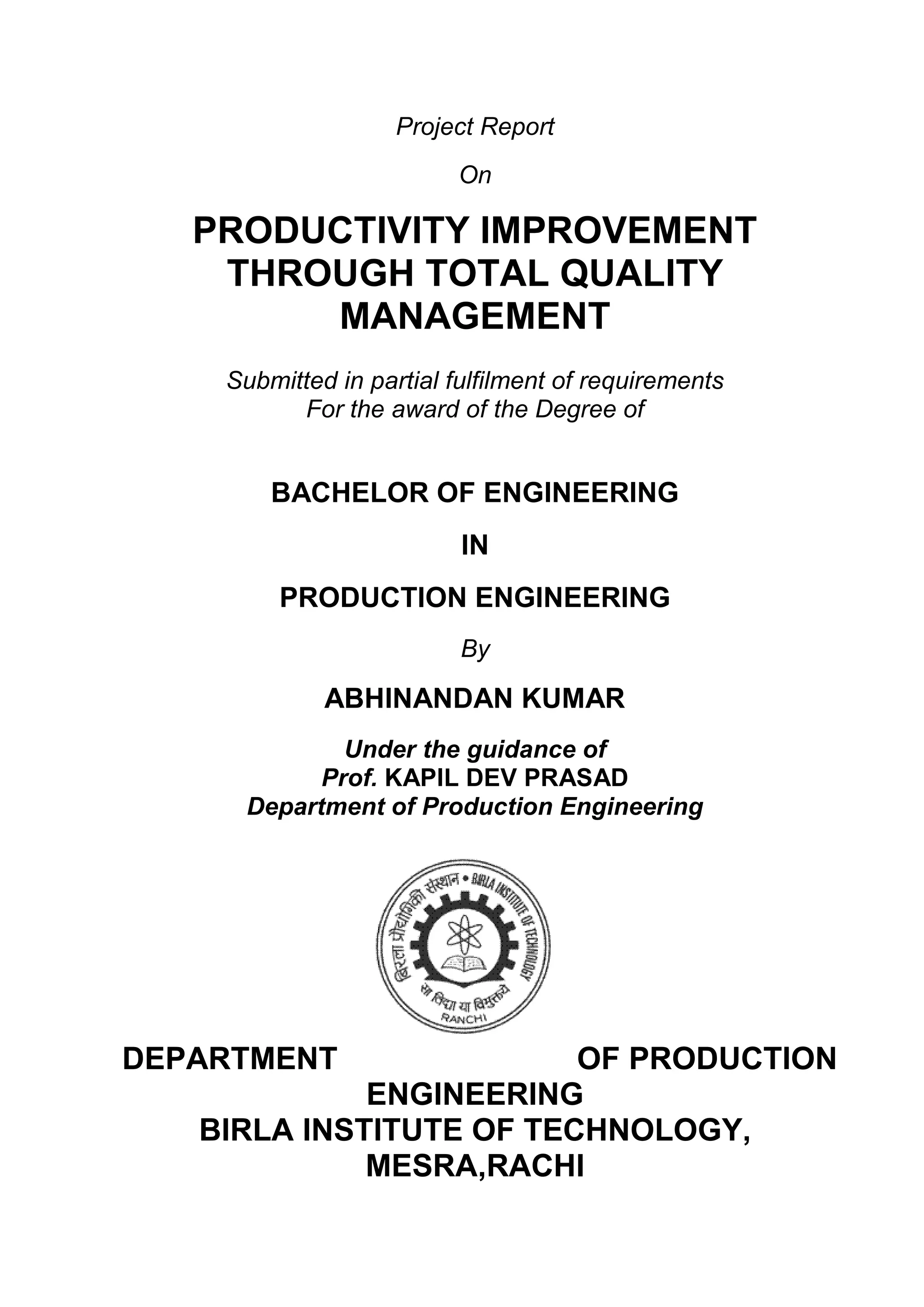 The project report discusses the critical role of total quality management (TQM) in improving productivity within industries, emphasizing its integration with lean manufacturing and constraint management. It highlights the necessity of fostering a culture focused on customer satisfaction while minimizing production costs, and outlines various principles and practices of TQM. The report aims to provide a holistic understanding of productivity improvement techniques and their impact on organizational performance.
