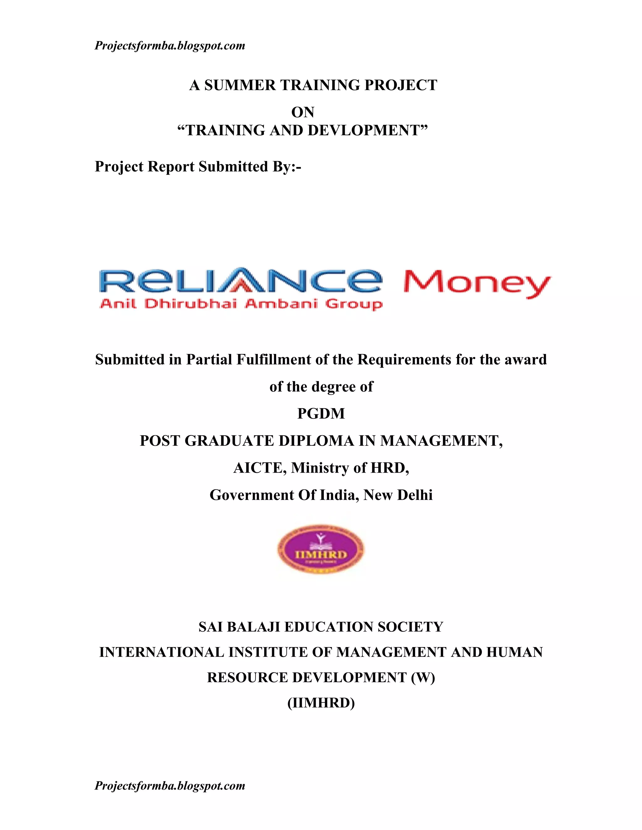 The document is a summer training project report submitted by a student to the IIMHRD in Pune, India. It discusses training and development at Reliance Money in India. The report includes sections on an introduction to Reliance Money, the importance of training, objectives of training, different training methods used, and a methodology for the project. It aims to study the impact of training on skill development at Reliance Money.