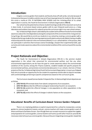 1) The Youth for Environment in Schools Organization (YES-O) at Sta. Fe National High School proposes establishing a curriculum-based science garden and fishpond to provide hands-on learning experiences for students.