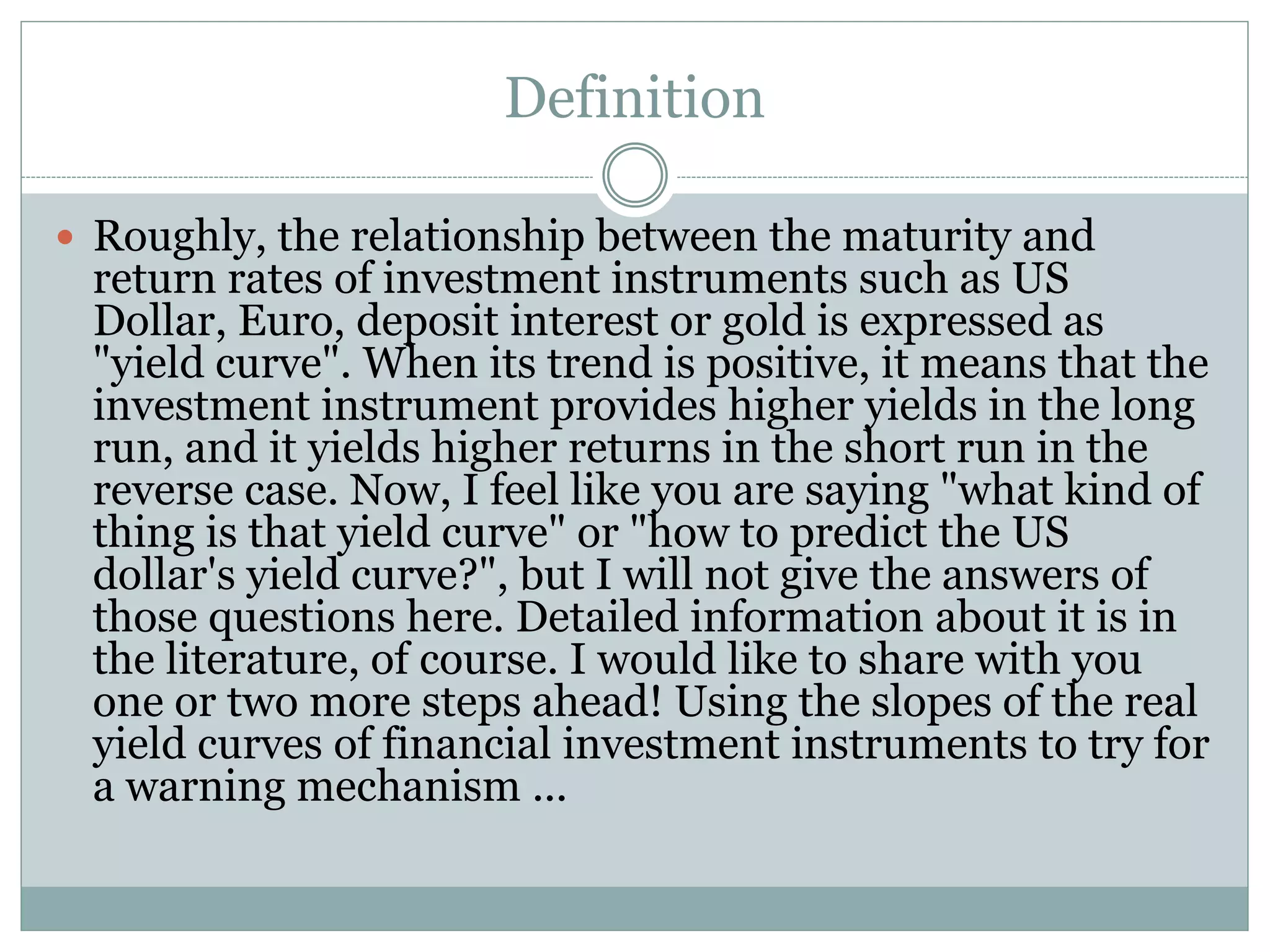 The document outlines a proposal for a warning mechanism based on the slopes of real yield curves of financial instruments, particularly focusing on the US dollar. It explains how to estimate these slopes and their angular counterparts to identify periodic cycles that forecast future yield movements. The analysis suggests potential reversals in the yield trends of various investment tools, emphasizing the importance of understanding these patterns for financial forecasting.