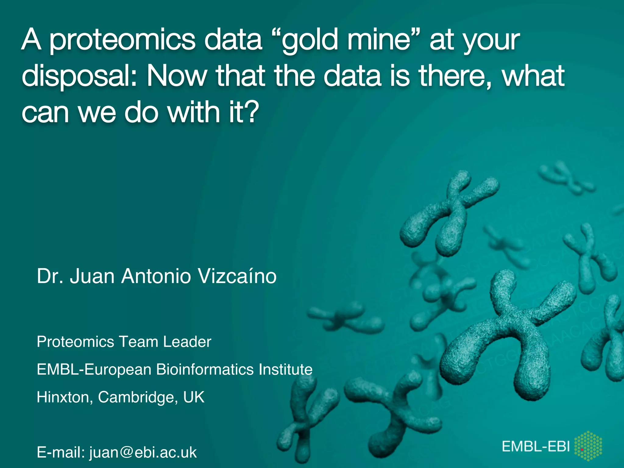 The document discusses the reuse of public proteomics data. It describes how data from the PRoteomics IDEntifications (PRIDE) Archive can be reanalyzed to conduct proteogenomics studies, discover new post-translational modifications and variants, and enable meta-analysis studies of protein-protein interactions and associations. It also examines challenges around analyzing the "dark proteome" of consistently unidentified spectra in public datasets and developing open analysis pipelines for proteomics data in cloud environments.