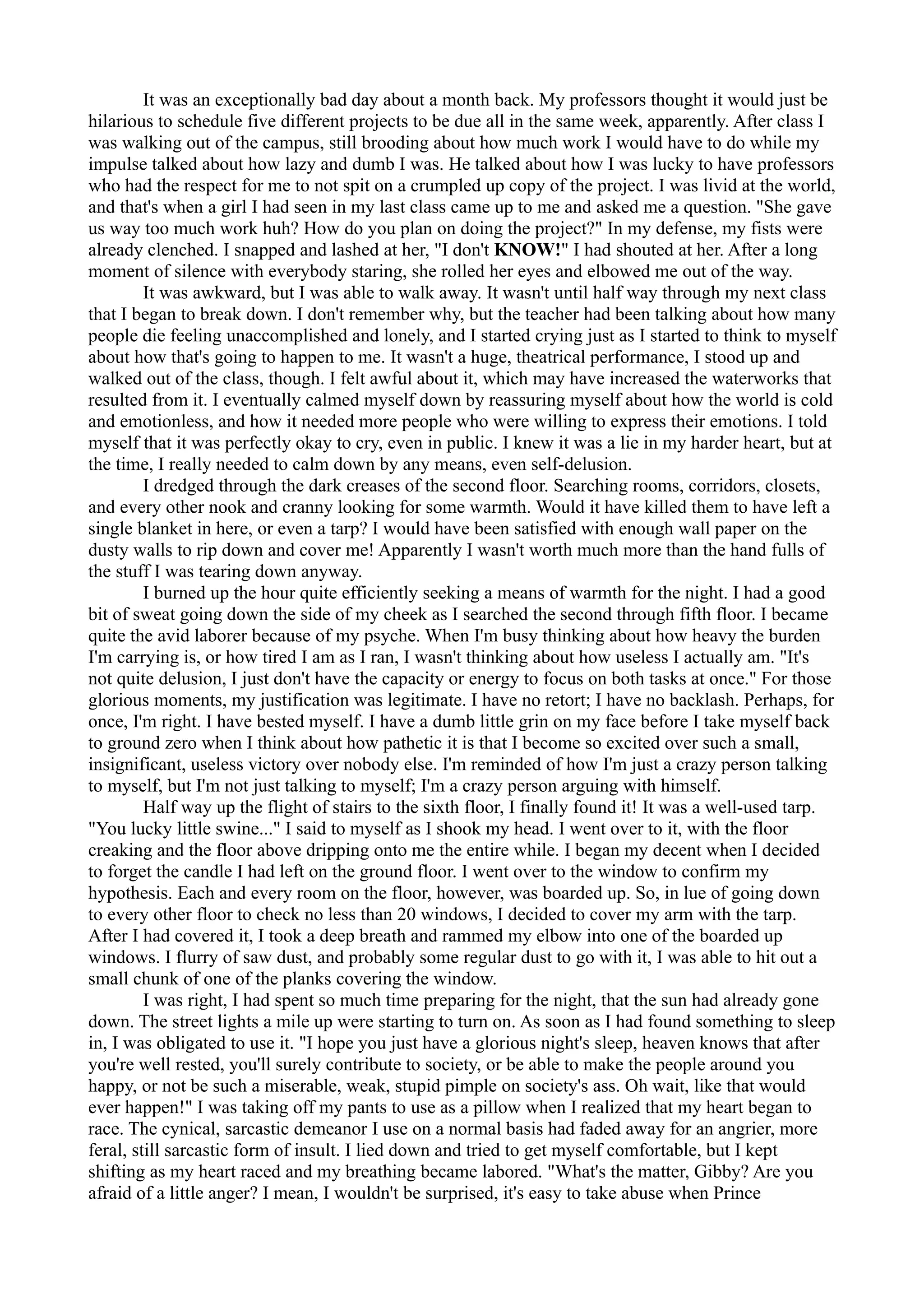 The narrative unfolds a psychologically fraught inner dialogue of a character struggling with self-hatred and feelings of inadequacy, set against a backdrop of a stormy night in an abandoned house. The character's torment takes the form of a second persona who relentlessly criticizes and berates him, pushing him towards despair and suicidal thoughts. Ultimately, as he faces a window contemplating his end, he grapples with the possibility of hoping for change despite his self-loathing and the belief that he is beyond redemption.