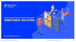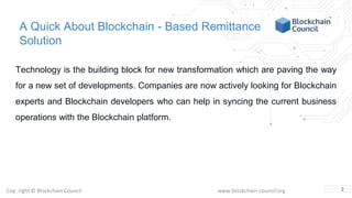 The document discusses the rising demand for blockchain-based remittance solutions, highlighting the inefficiencies in current money transfer systems. It emphasizes the benefits of blockchain technology such as eliminating third-party involvement, enhancing transaction security, and enabling faster transfers. Additionally, it notes the need for blockchain professionals and mentions various certification programs offered by the Blockchain Council.