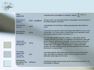 This document discusses network information processing and maximum information transfer in networks. It begins by formulating the main problems of unicast, multicast, and broadcast transfer of data in a network. It then shows that the maximum information transfer for unicast can be determined using the maximum flow minimum cut theorem, which gives a polynomial time solution. For multicast, maximum transfer is bounded by considering a super terminal node, but achieving maximum diversity at destinations is challenging. The document explores duplicate-and-forward routing and network coding approaches for multicast transfer.