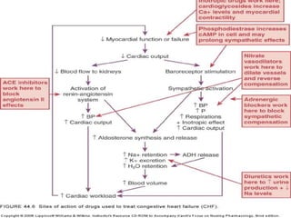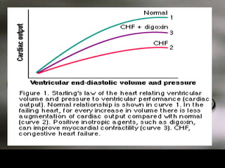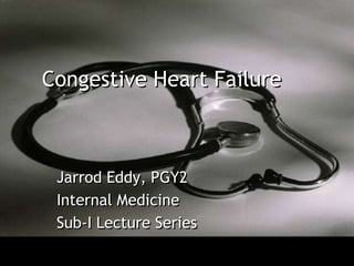 The document discusses congestive heart failure by describing the clinical presentation, underlying cardiac diseases that can cause it, how cardiac physiology relates to concepts like preload, afterload and contractility, classifications of heart failure, clinical exam findings, treatment approaches focusing on reducing preload and afterload and increasing contractility, and sample admission orders for an inpatient with heart failure.