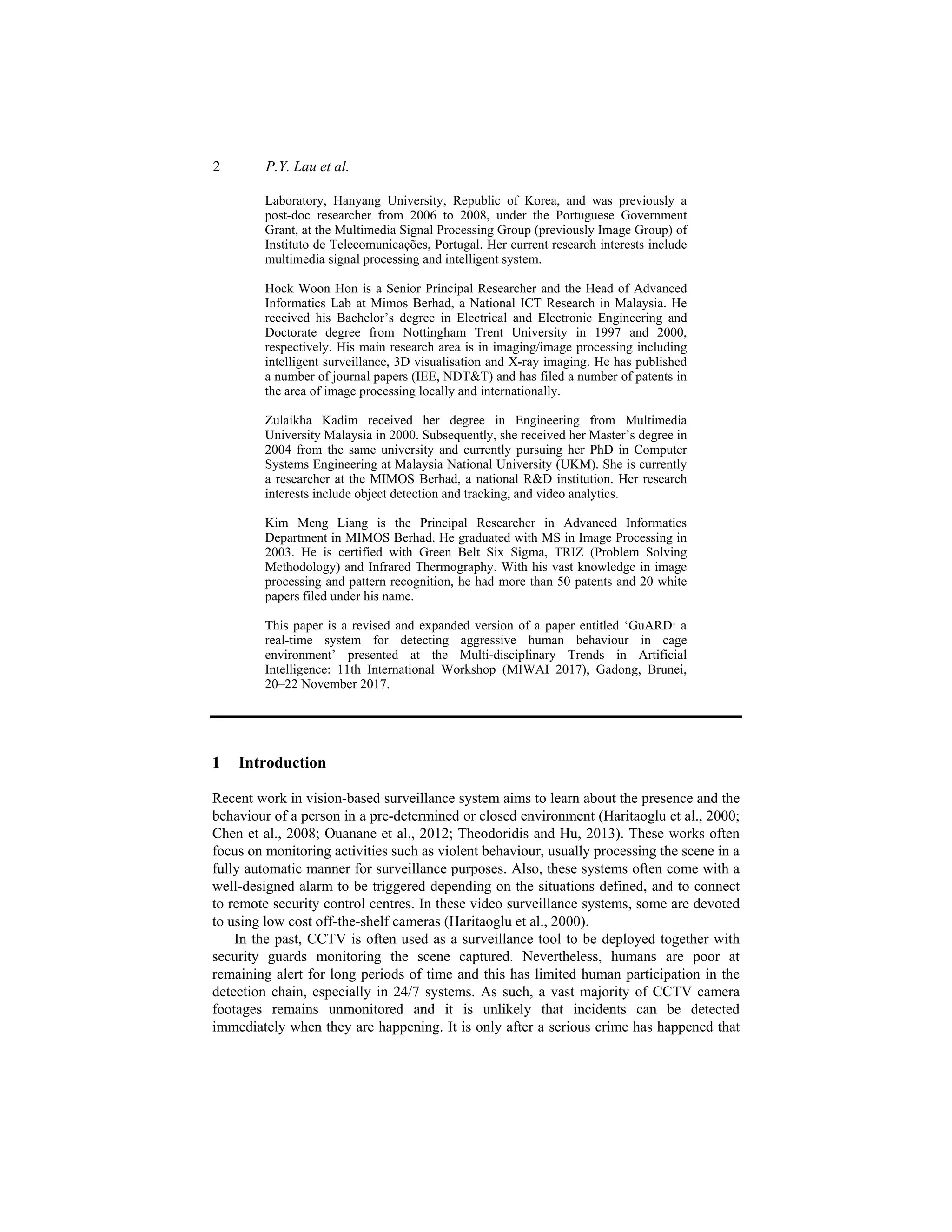 This document proposes a real-time system called GuARD that detects aggressive human behavior across multiple cameras in an enclosed cage environment. The system uses background subtraction, perspective correction, scale correction, and a cooperative detection scheme across cameras to identify aggressive behavior regions despite challenges like fish-eye lenses, low resolution, multiple people, and low lighting. Experimental results showed the system can successfully identify aggressive behaviors in real-time even on low-end computers.