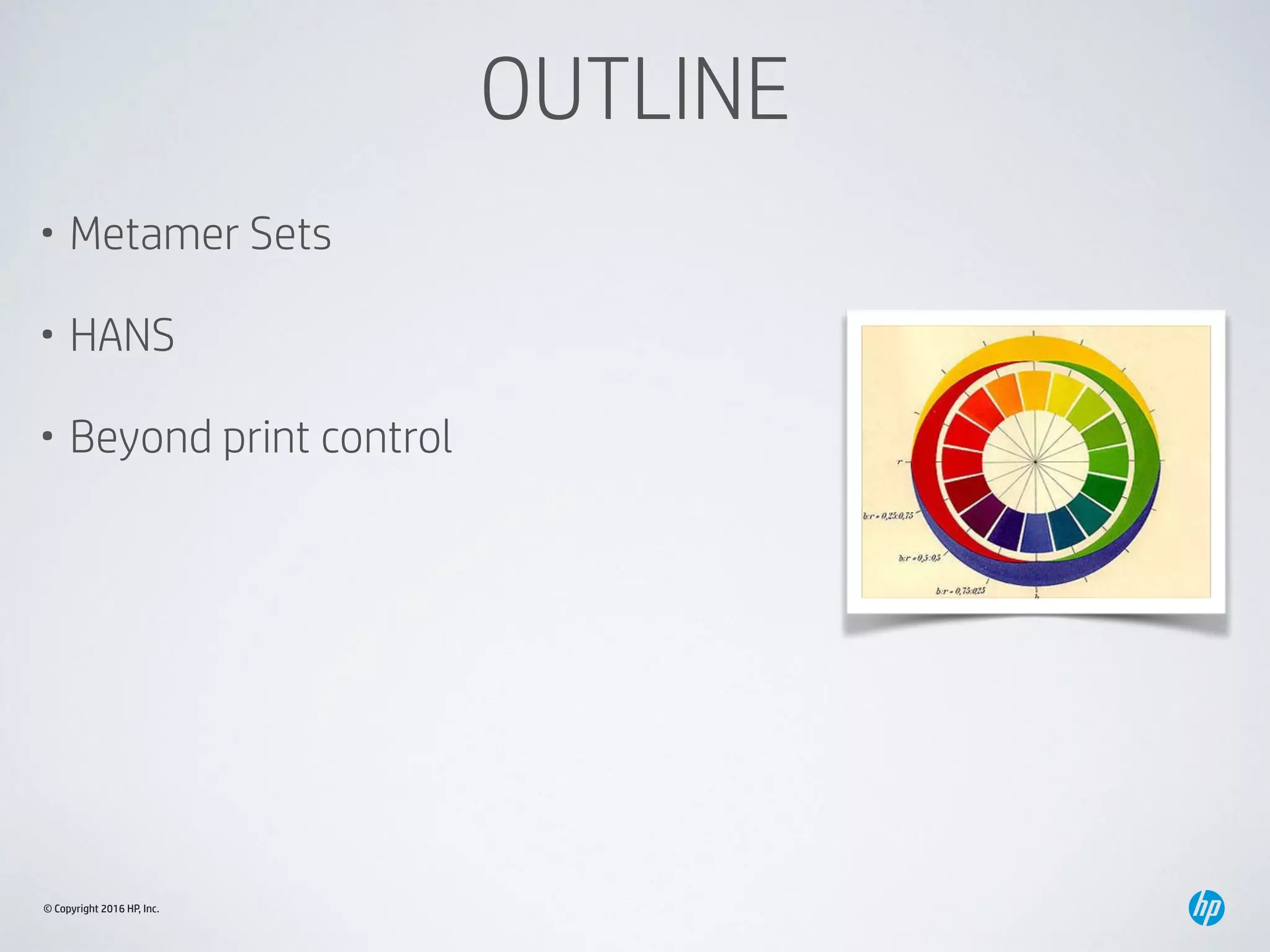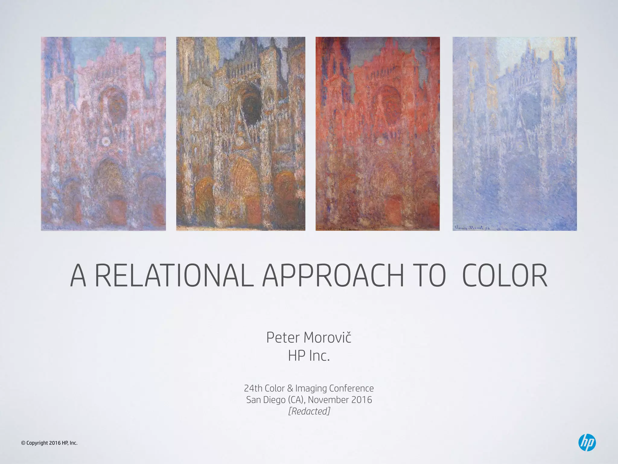 This document summarizes Peter Morovič's presentation on a relational approach to color at the 24th Color & Imaging Conference in 2016. It discusses metamer sets, the Halftone Area Neugebauer Separation (HANS) model, and applications beyond print control. The key points are that color is perceived based on the relationship between light, surfaces, and observers, metamerism occurs when different spectral combinations produce the same color, and HANS provides a way to model subtractive color mixtures using convex combinations of Neugebauer primaries.