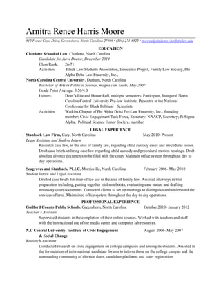 Arnitra Renee Harris Moore is a candidate for Juris Doctor at Charlotte School of Law in December 2014. She has a Bachelor of Arts in Political Science from North Carolina Central University, magna cum laude. Moore has legal experience as a legal assistant and student intern at two family law firms, where she conducted legal research, drafted case briefs and divorce documents. She also has teaching experience as a teacher's assistant for Guilford County Public Schools and research experience as a research assistant at N.C. Central University's Institute of Civic Engagement and Social Change.