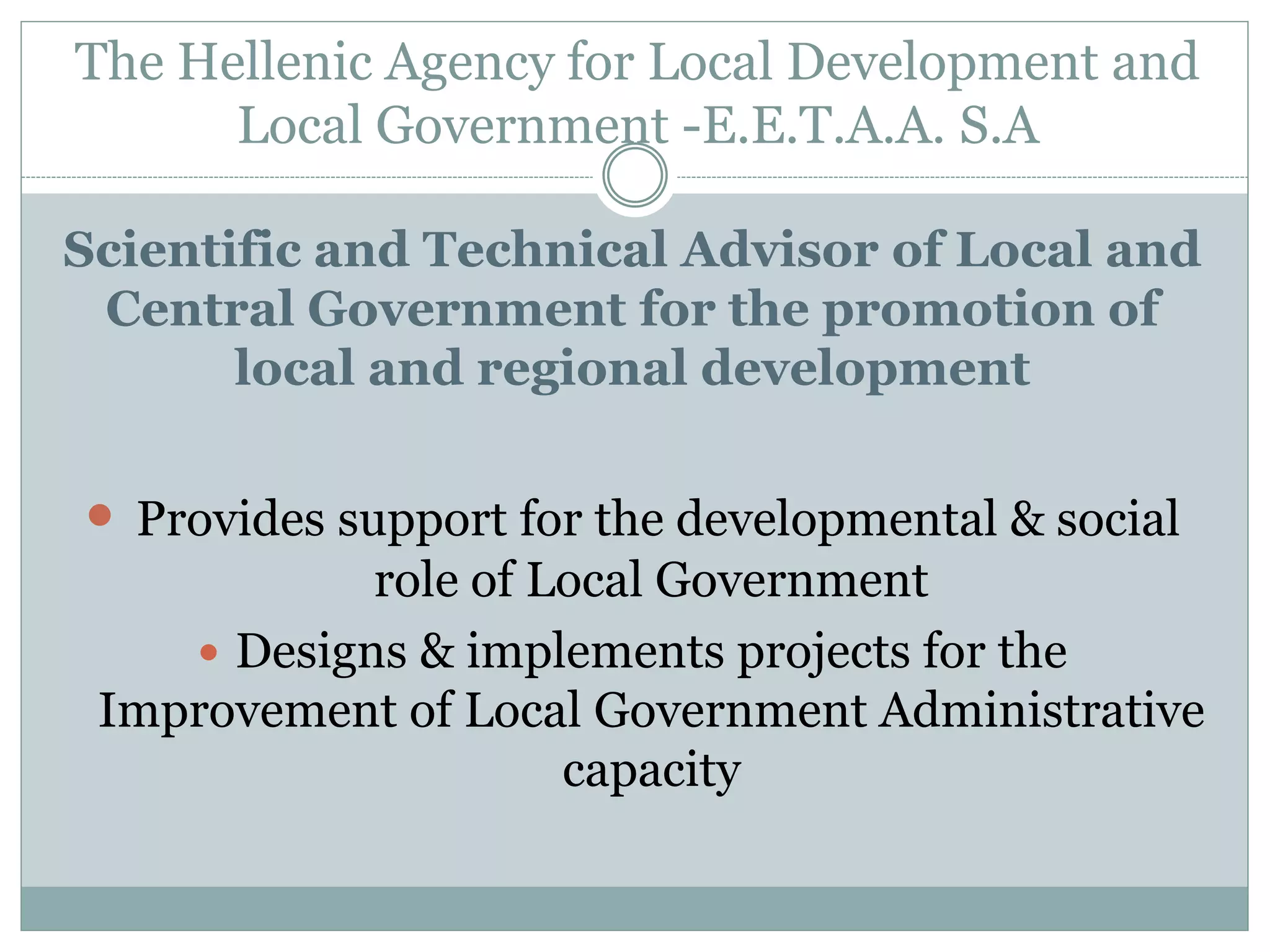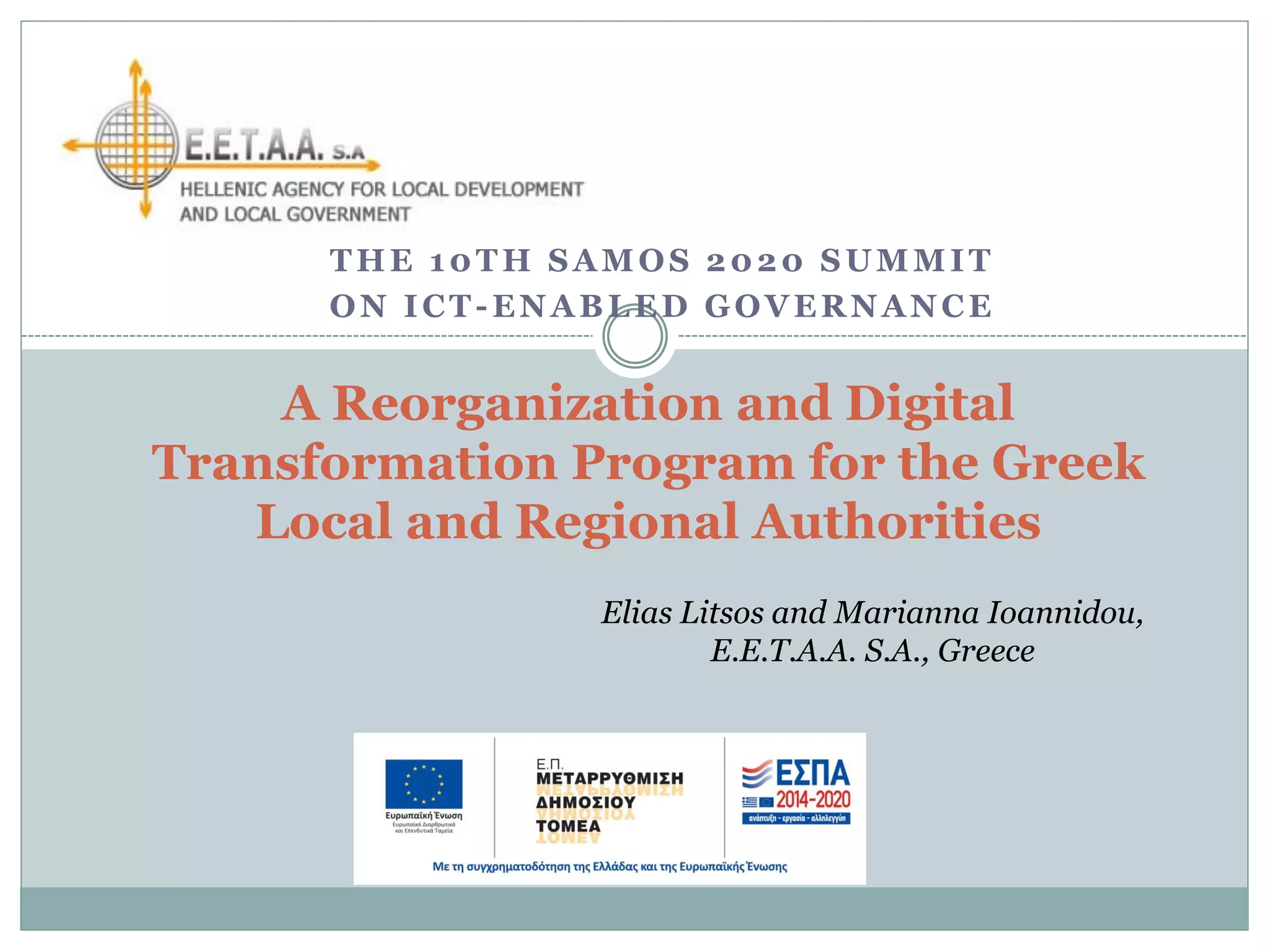 The document outlines a reorganization and digital transformation program for Greek local and regional authorities aimed at enhancing administrative capacity through simplification, digitization, and improved management standards. Key actions include training municipal staff, establishing e-government infrastructures, and implementing new operational models, supported by significant funding from the National Strategic Reference Framework. The initiative seeks to elevate the performance of local governments to meet European standards in digital public services.