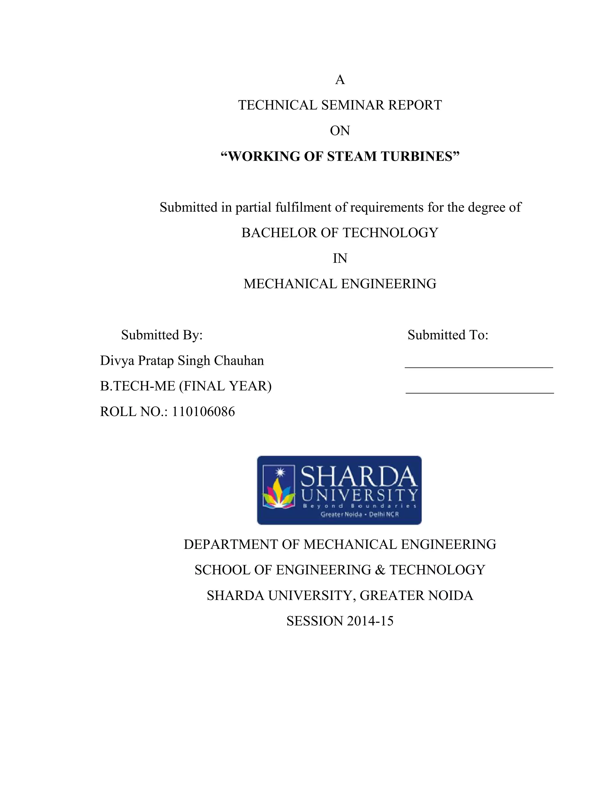 This document is a technical seminar report submitted by a student to fulfill requirements for a Bachelor of Technology degree in Mechanical Engineering. The report discusses the history and working principles of steam turbines, including their advantages and disadvantages. It describes different types of steam turbines such as impulse and reaction turbines. It also covers topics like compounding, steam supply and exhaust conditions, turbine components, operation principles, applications, and thermodynamics of steam turbines. The document contains detailed information presented over multiple sections and references.