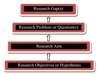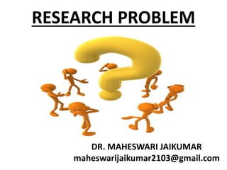 This document discusses identifying and formulating a research problem. It explains that a research problem is a question a researcher wants to answer or a problem they want to solve. Selecting a good research problem depends on factors like the researcher's knowledge and interests. The identification of a research problem is the first step in the research process. Common sources for research problems include personal and practical experience, literature reviews, previous research, theories, and discussions with experts. Formulating a clear research problem with relevant components is an important but challenging part of the research process.