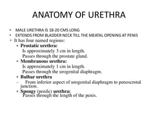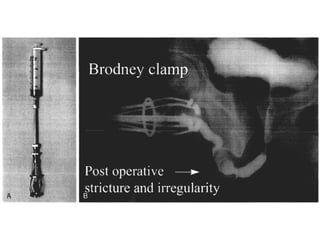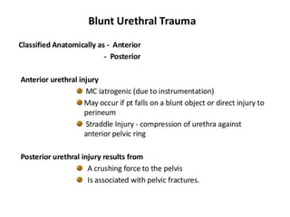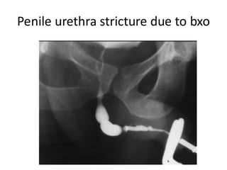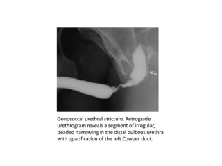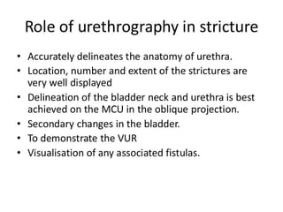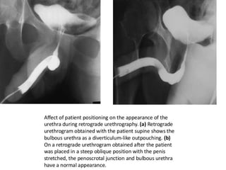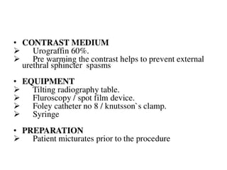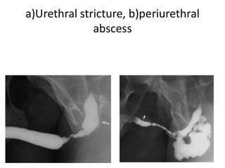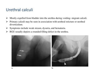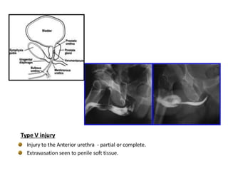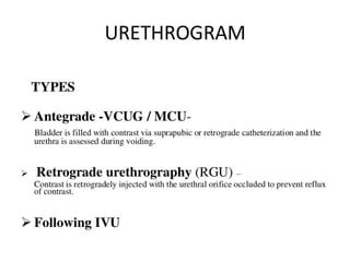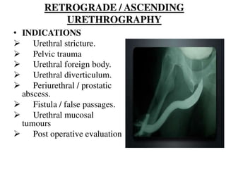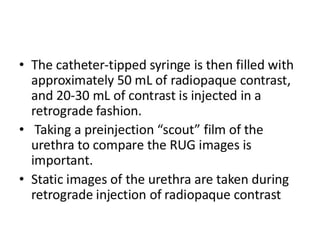 The document discusses retrograde urethrography (RGU) and its associated risks, including the potential for mucosal edema and complications from injecting contrast fluid. It highlights the importance of antibiotic cover in certain cases and the efficacy of cystography for diagnosing pelvic fractures, particularly in patients with hematuria. Additionally, it notes the incidence of urinary tract infections and reactions to contrast mediums in patients undergoing these procedures.