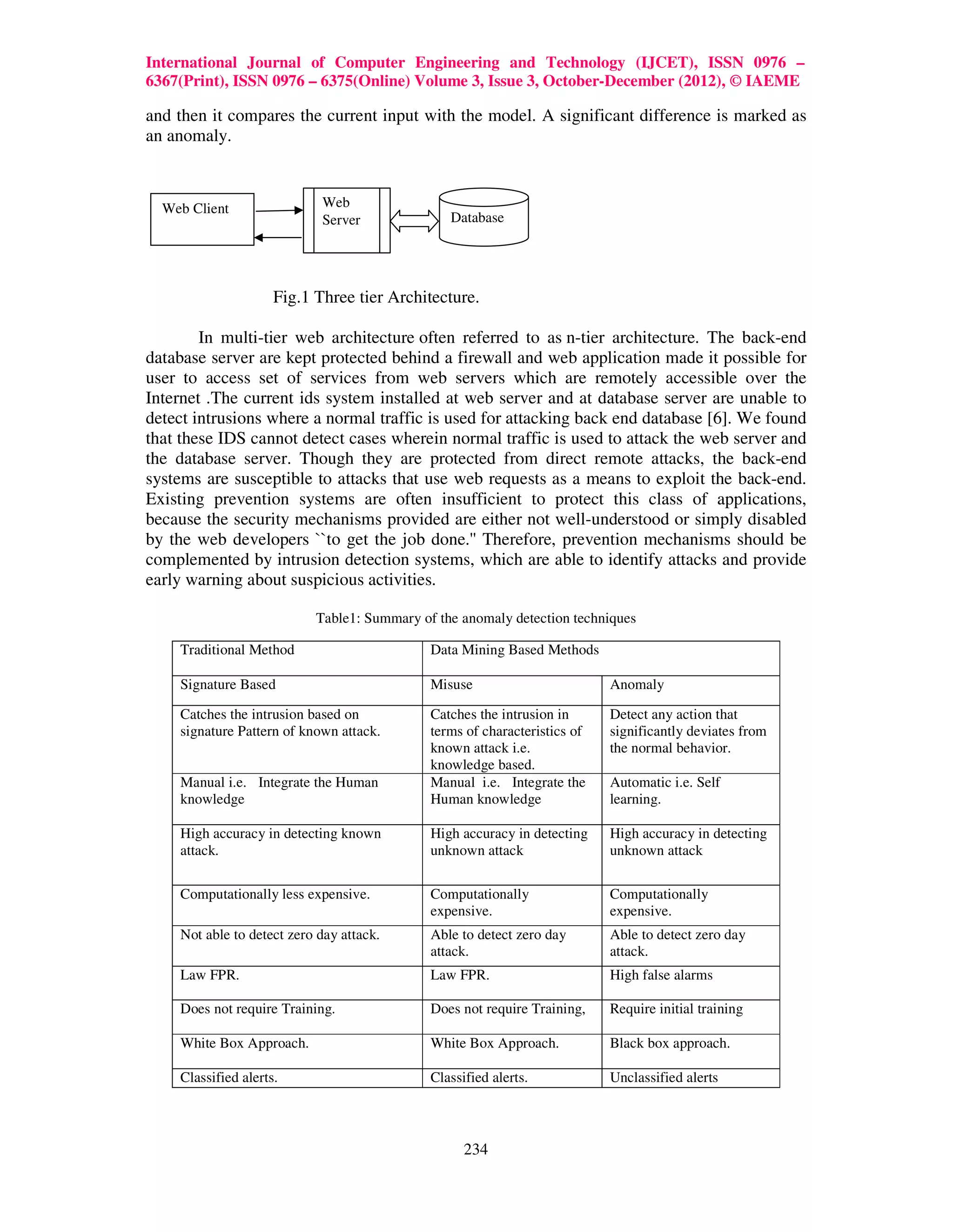 This document provides a review of anomaly-based intrusion detection techniques for multi-tier web applications. It begins with an introduction to intrusion detection systems and the differences between misuse detection and anomaly detection. It then reviews several existing anomaly detection approaches including rule-based systems, multimodal approaches, state transition analysis, profiling of internal application states, and combined approaches that analyze both web requests and database queries. The key advantages and disadvantages of each technique are discussed. Overall, the document analyzes different methods for building behavior models and detecting anomalies to identify intrusions in complex multi-tier web applications.