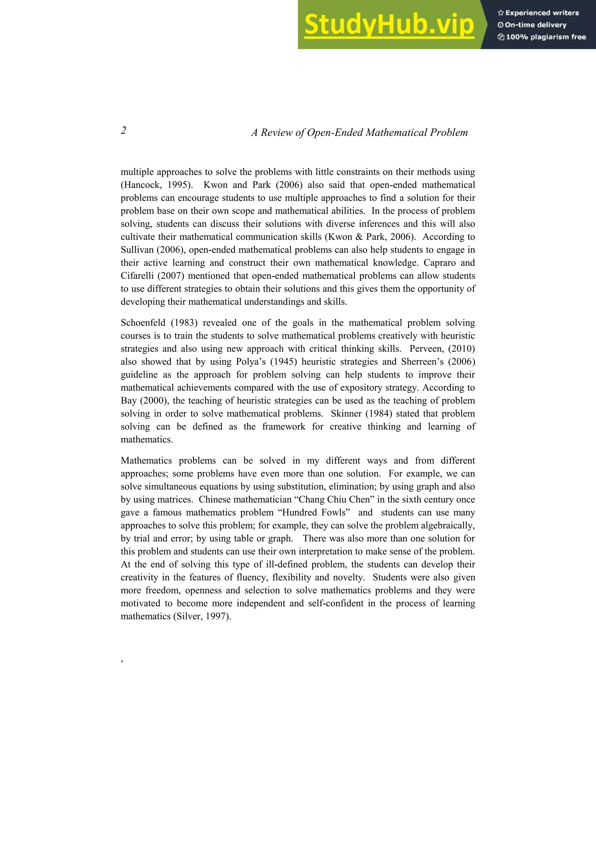 This study examined the use of open-ended mathematical problems to stimulate problem solving abilities in students. Five mechanical engineering students participated in the study. They were given an open-ended mathematical problem called "Hundred Fowls" to solve collaboratively while being video recorded. The students used different problem solving approaches like trial and error, graphs, and programming. They were also interviewed afterwards. A questionnaire was given to 74 additional mechanical engineering students to understand their preferences in the different stages of creative problem solving. The results showed that the students were able to solve the open-ended problem collaboratively based on the stages of creative problem solving.
