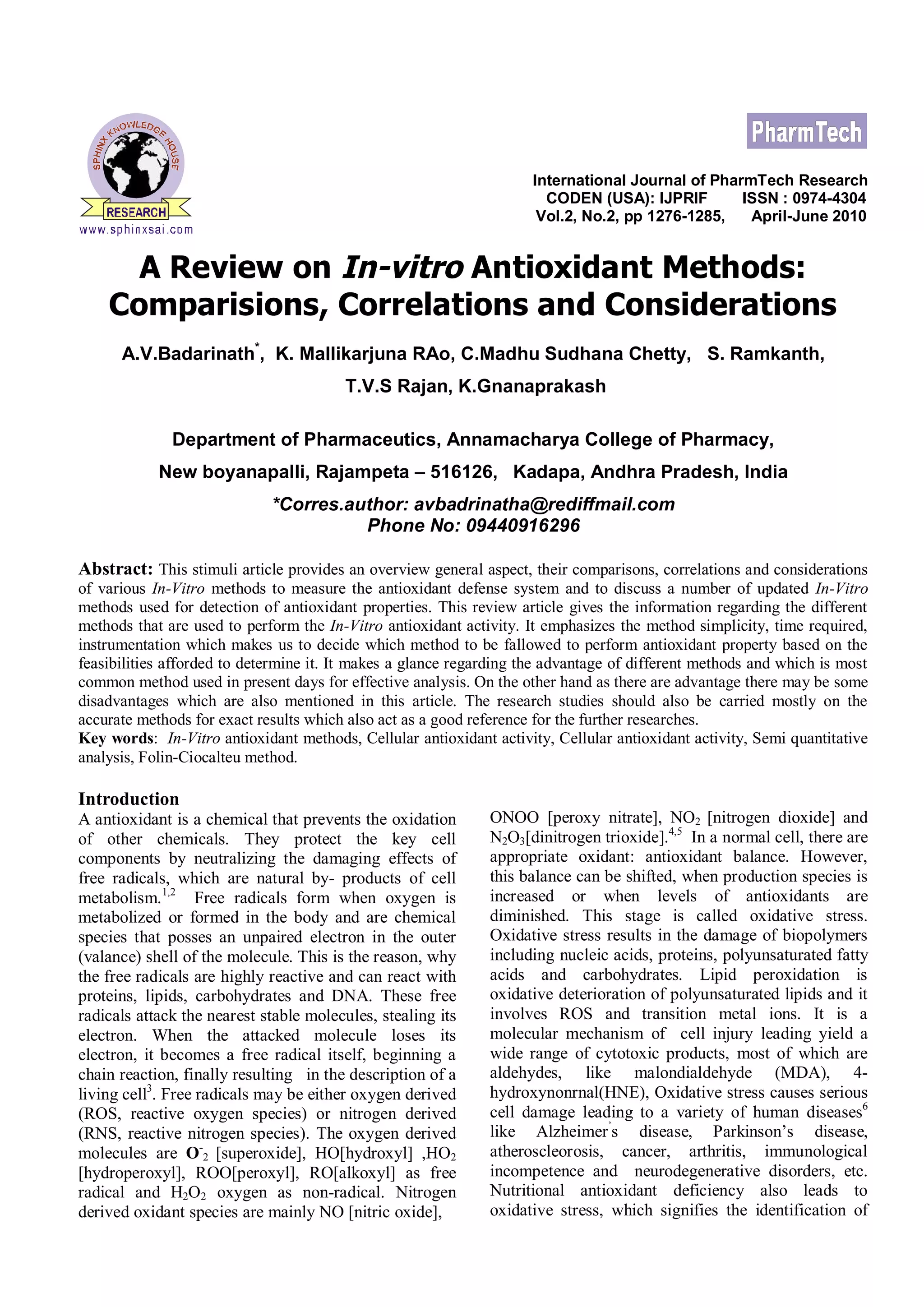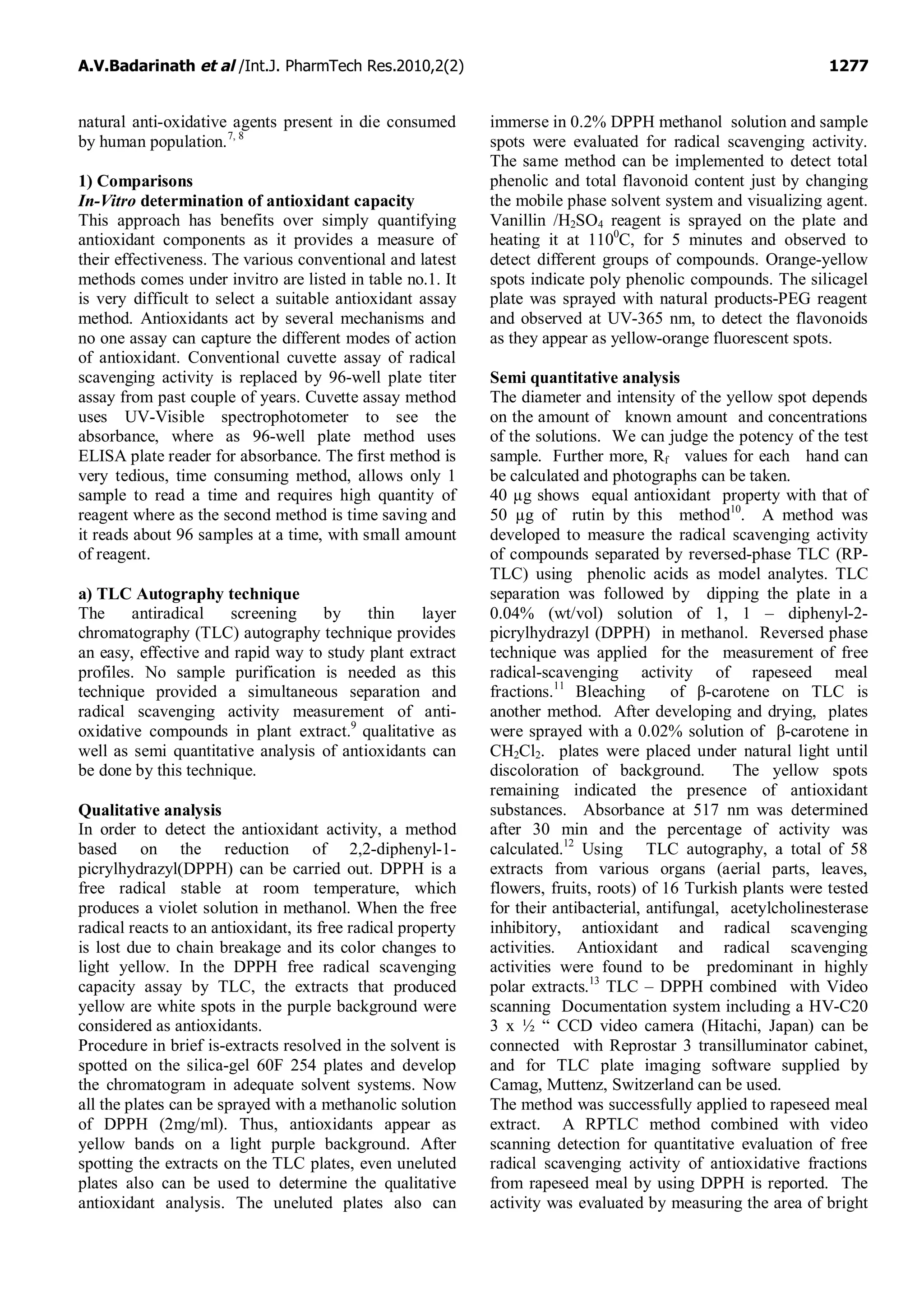 This document provides an overview and comparison of various in-vitro methods used to measure antioxidant activity, including their advantages and disadvantages. It summarizes several common methods such as the Thin Layer Chromatography autography technique, Cellular Antioxidant Activity assay, Dye-Substrate oxidation method, and Cupric Ion Reducing Antioxidant Capacity method. The document emphasizes selecting methods based on feasibility, simplicity, required instrumentation and ability to effectively analyze antioxidant properties.