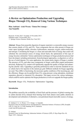 This document reviews various techniques for optimizing biogas production and upgrading biogas quality through CO2 removal. It discusses pretreatment of substrates, co-digestion, use of serial digesters, and different methods for biogas upgrading including pressure swing adsorption, membrane separation, and CO2 absorption to purify biogas. The optimization of biogas production and upgrading is important as biogas can be a substitute for conventional fossil fuels but the presence of CO2 and other components can reduce its quality and economic feasibility for certain applications.