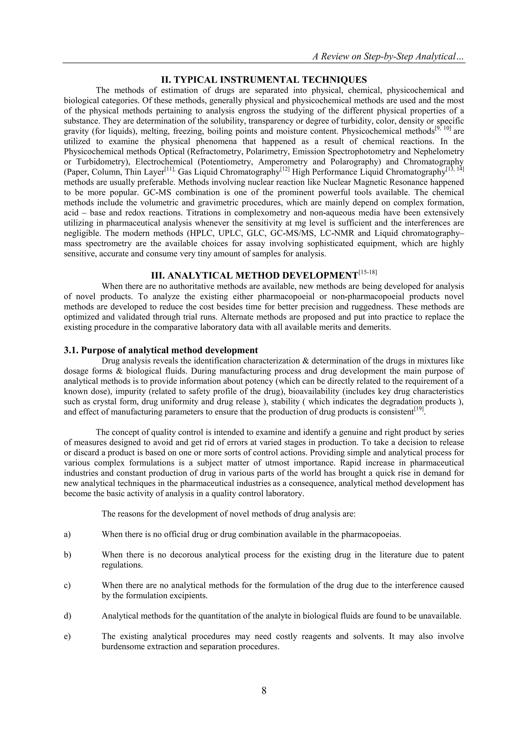 This review discusses the essential steps and requirements for analytical method validation in pharmaceutical analysis, highlighting the importance of accurate and reproducible results for drug development and manufacturing. It outlines various analytical techniques, their classification, and development procedures, emphasizing the role of quality control and regulatory compliance. The document also details system suitability parameters and validation criteria necessary for ensuring the reliability of analytical methods.