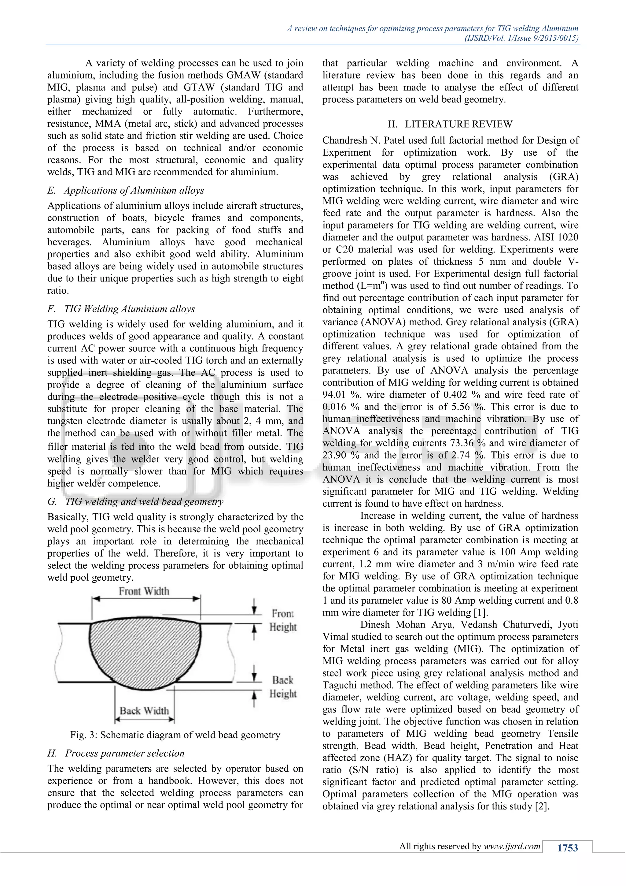 The document reviews techniques for optimizing process parameters in TIG welding of aluminum, highlighting the advantages and characteristics of the TIG welding process. It discusses the importance of selecting optimal welding parameters to achieve high-quality welds, particularly in aluminum alloys, and presents findings from various studies on the impact of different process variables. The paper emphasizes the use of methodologies such as grey relational analysis and response surface methodology to enhance welding processes.