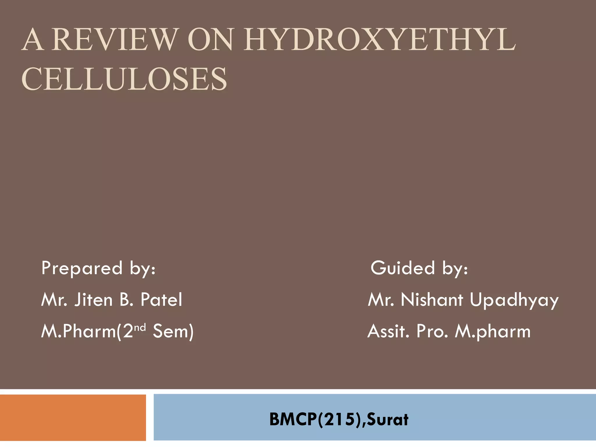 This document provides a review of hydroxyethyl celluloses. It describes hydroxyethyl cellulose as a white powder that is odorless, tasteless and hygroscopic. It is used as a thickening agent, suspending agent, tablet binder and viscosity-increasing agent. The document compares hydroxyethyl cellulose to other polymers, finding it has high polymer dissolution and drug release capability. Hydroxyethyl cellulose shows good mucoadhesive properties compared to other polymers like sodium carboxymethyl cellulose. The conclusion is that hydroxyethyl cellulose is widely used in pharmaceutical formulations between concentrations of 1.5-3% weight/weight.