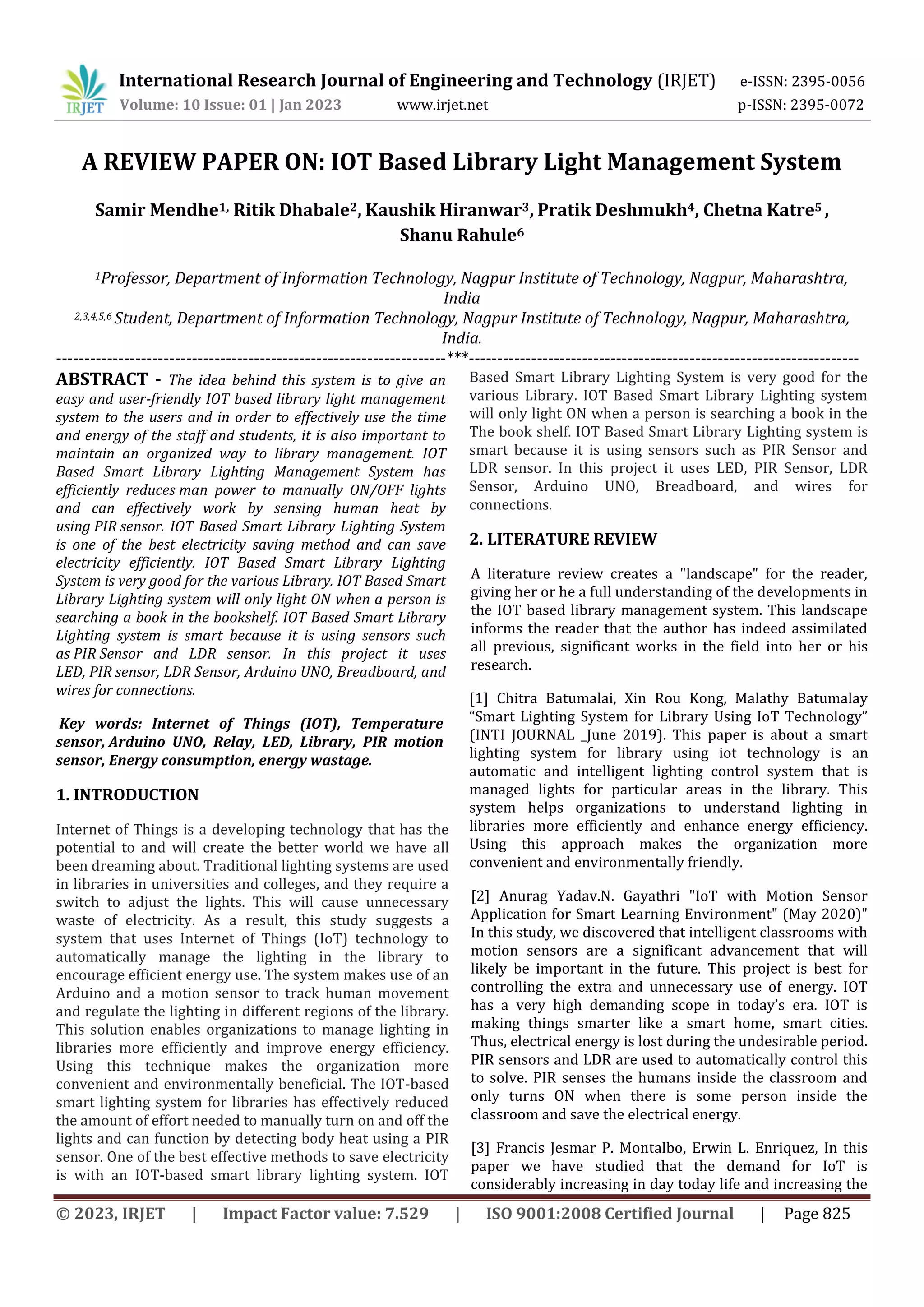 This document provides a review of an IOT based library light management system. It discusses using sensors like PIR and LDR connected to an Arduino board to automatically turn lights on and off based on detecting human presence. This can help save electricity by reducing unnecessary light usage. The system is described as using LED lights controlled by a relay module based on input from the sensors. Advantages include energy savings and reducing manual effort. Potential applications are discussed like using in other buildings or with additional sensors for better control.