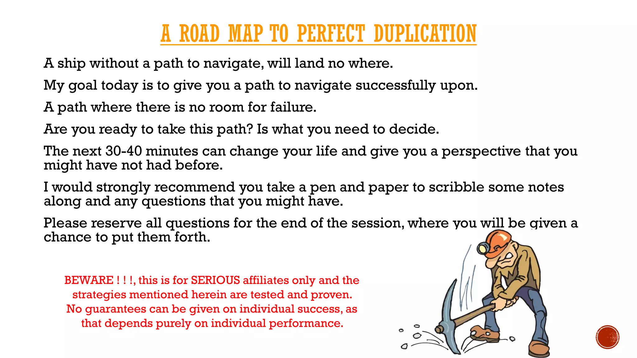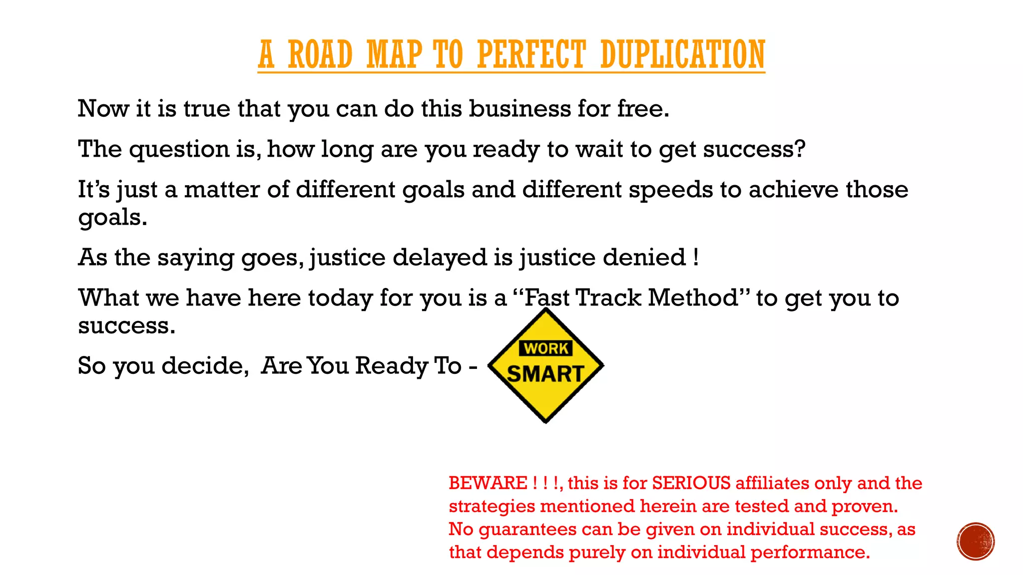 This document outlines a structured approach for serious affiliates in the SFI business to achieve success through a strategy of duplication. It emphasizes the importance of becoming an Executive Affiliate, sponsoring new affiliates, and teaching them the same steps to create a network that leads to residual income. The document also highlights the necessity of commitment to one's dreams and the potential for financial gain through recommended standing orders and follow-up systems.