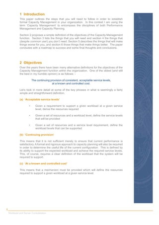 The document outlines steps for establishing formal capacity management in an organization. It argues that real-time monitors are a waste of time and advocates for a proactive approach using tools that can predict potential problems in advance. The key things needed are senior management commitment, process definition, and the right people and tools. Things that don't help include relying only on threshold alerts, dashboards that update too frequently, and disconnected users and suppliers.