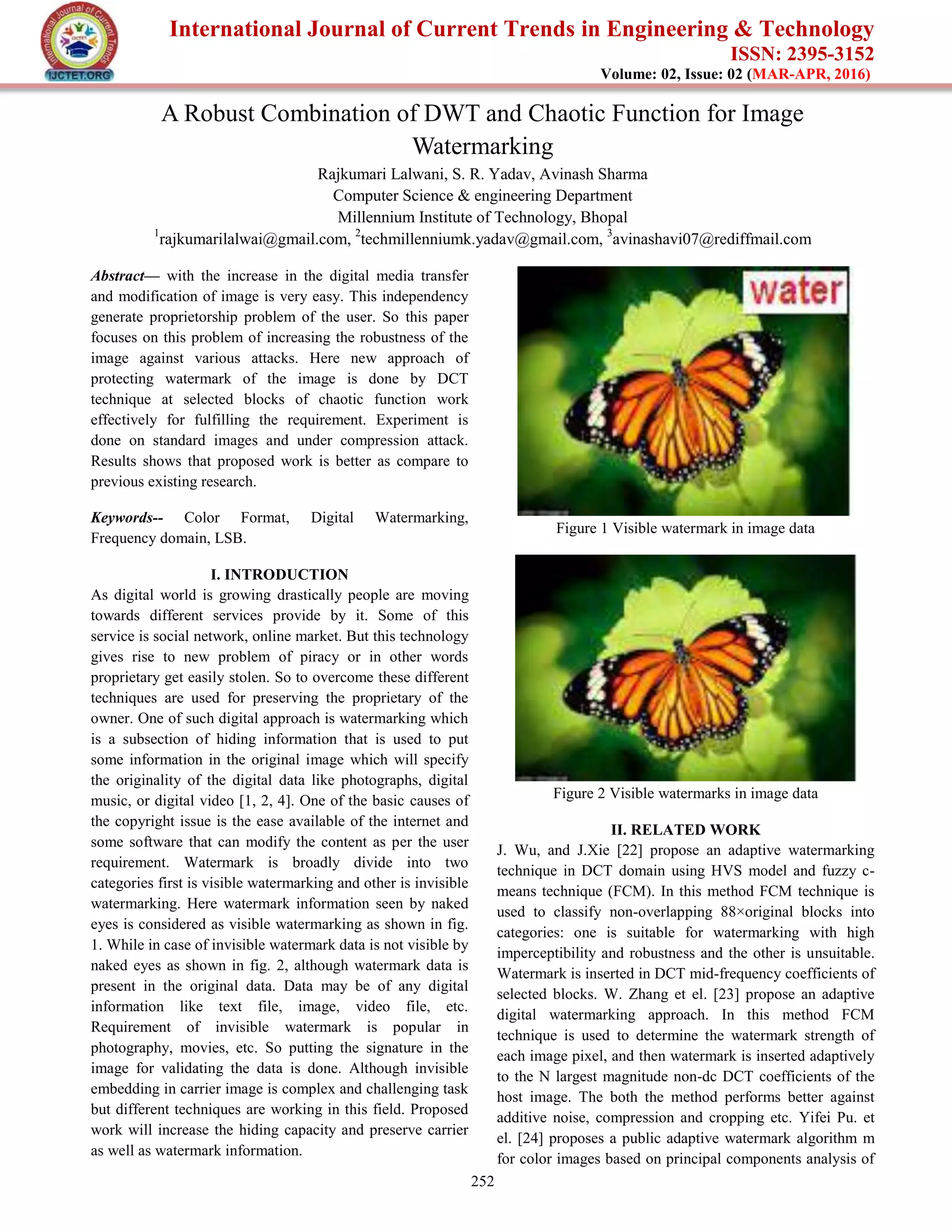 This document summarizes a research paper on a robust image watermarking technique that combines discrete wavelet transform (DWT) and a chaotic function. The proposed method embeds a watermark into selected blocks of the low-frequency DWT subband of an image. It calculates the Euclidean distance between blocks of the watermark and image to select the most similar block for embedding. Experimental results on standard test images show the proposed method achieves better performance than previous methods in terms of PSNR and structural similarity under compression attacks. The extraction accuracy remains high even with noise attacks, though it degrades more under filtering attacks.