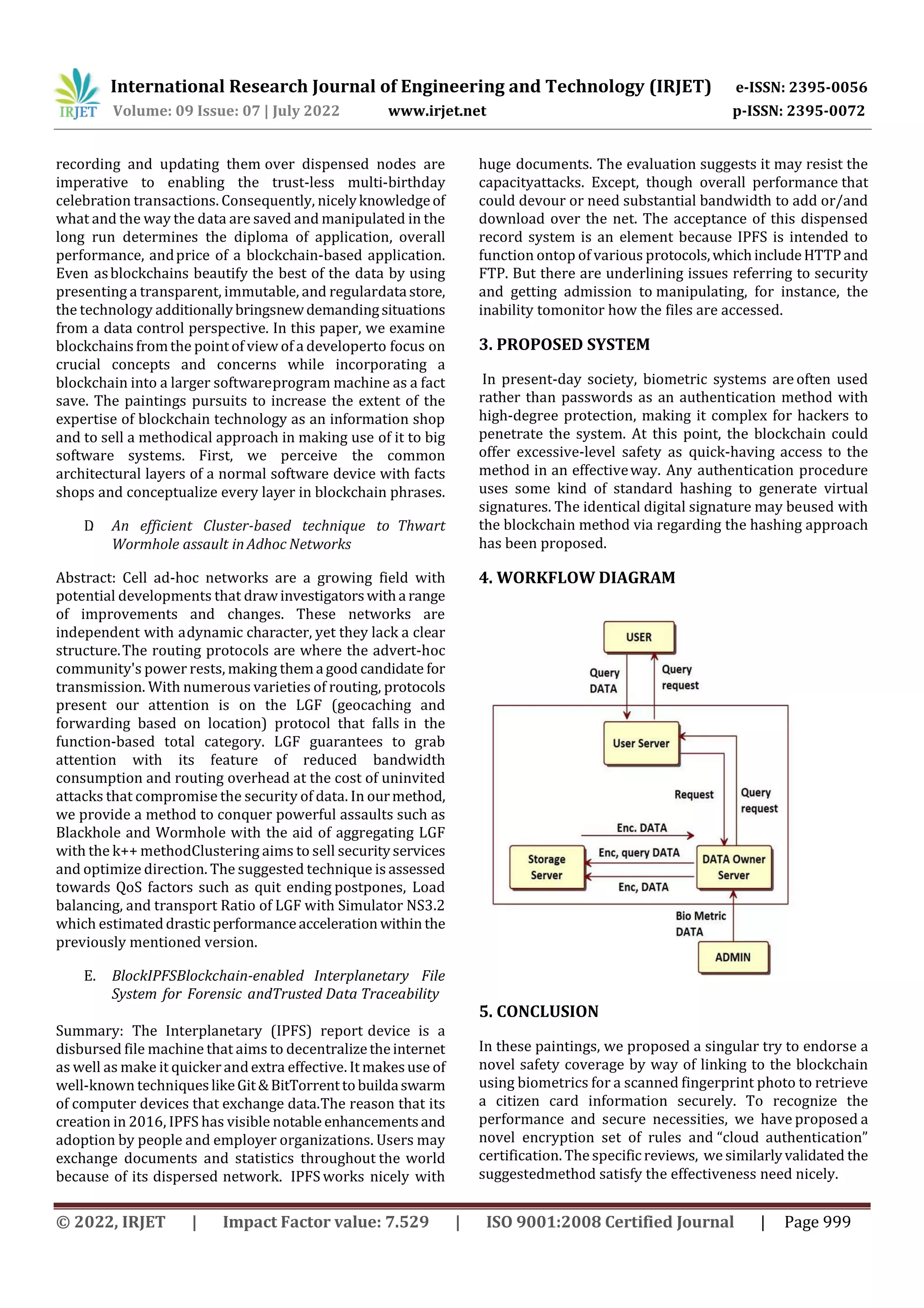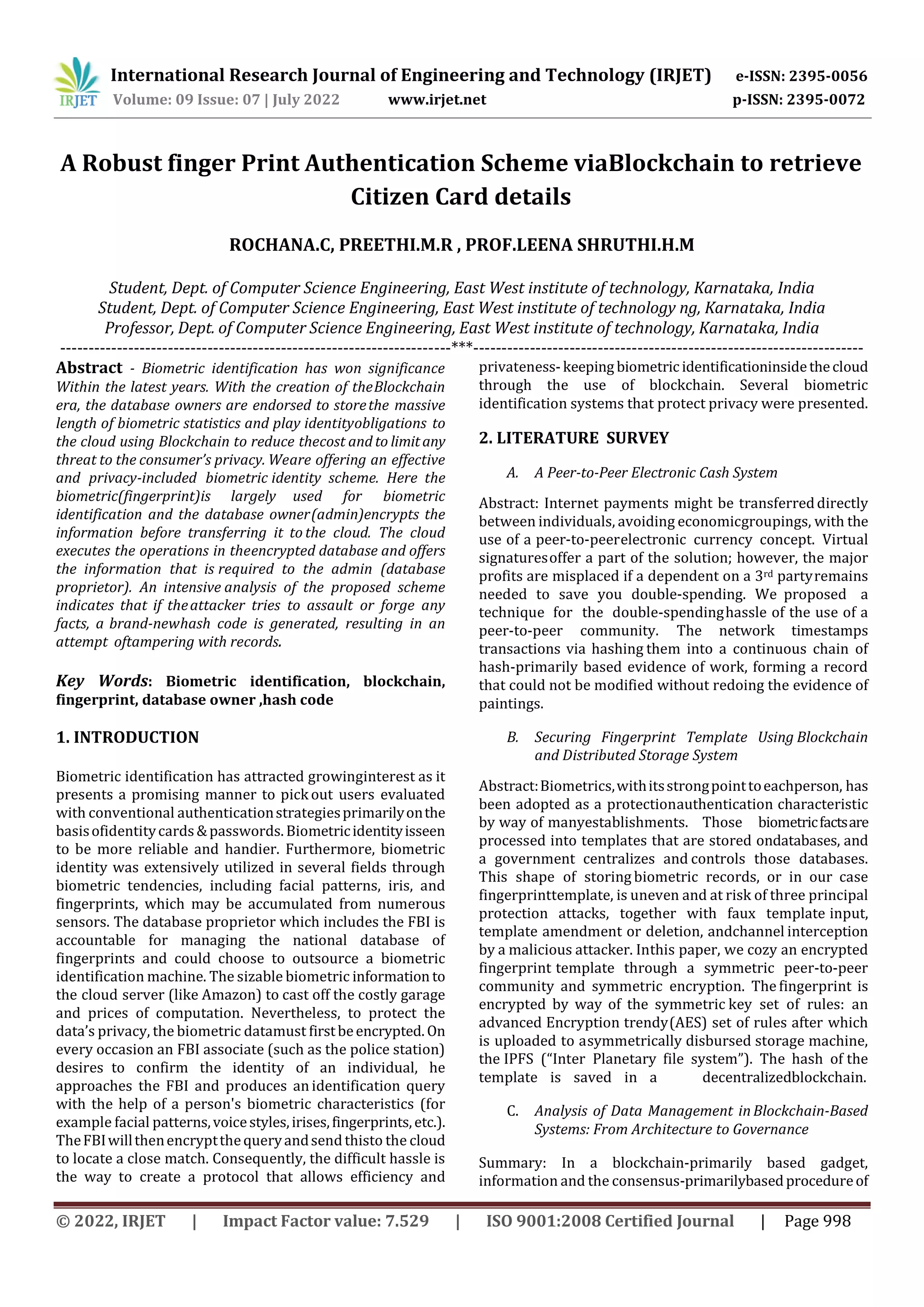 This document proposes a blockchain-based fingerprint authentication scheme to securely retrieve citizen card details. The scheme involves encrypting fingerprint data before transferring it to the cloud for storage. When identity verification is needed, an encrypted query is sent to the cloud to find a fingerprint match. Any changes to the fingerprint data would generate a new hash, preventing tampering. The proposed method aims to provide effective and privacy-preserving biometric identification using blockchain technology.