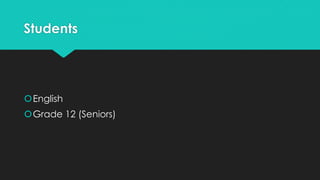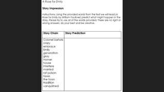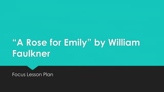 This document outlines a lesson plan for teaching William Faulkner's short story "A Rose for Emily" to 12th grade English students. The goals are for students to analyze the character of Emily through a written journal, identify vocabulary terms in context, and write a narrative character journal using evidence from the text. The lesson will begin with activating prior knowledge about the Southern Gothic genre and a story impression exercise. Students will then take a vocabulary pre-test, read guided questions, discuss vocabulary in groups, and write a character analysis journal to assess learning.