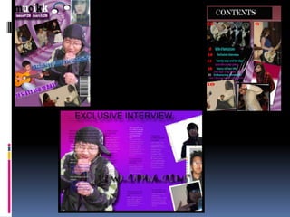 1) The student produced a music magazine called "mucikk" for their media studies coursework, which challenges conventions of real music magazines through its unique cover design and layout. 2) The magazine's target audience is young teenagers aged 16-18, as identified through a questionnaire. It does not represent any particular social groups but rather aims to appeal to all music fans. 3) The student has learned important skills for constructing media products through using Photoshop and a digital camera for the magazine, including photo editing techniques and different camera settings.