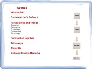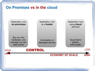 The document discusses different approaches to cloud computing including on-premises vs cloud models. It outlines some key factors to consider such as control, economy of scale, customization, security, and availability. The document also presents an agenda for a sales presentation on cloud computing covering definitions, perspectives, customer considerations, and a model for putting it all together from lead generation to post-sales support.