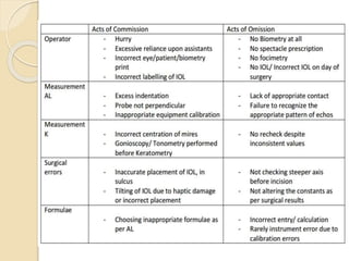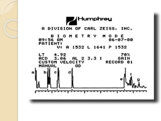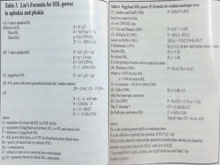 Dr. Pravin Madhukar Bhat discusses advancements in cataract surgery, emphasizing the importance of accurate biometry and IOL power calculations in achieving optimal refractive outcomes. Various techniques for measuring axial length and calculating intraocular lens power are reviewed, highlighting the evolving methodologies, including ultrasound biometry and optical coherence biometry, as well as the significance of appropriate IOL formulas for different patient scenarios. The document also addresses special circumstances affecting IOL power determination in cases like corneal refractive surgery and pediatric cataracts.