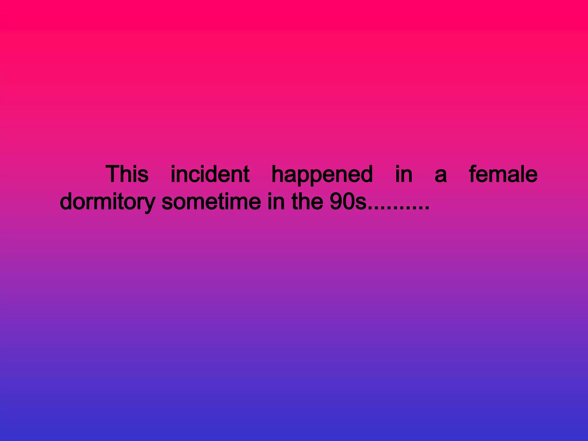 A female student committed suicide by jumping from the roof of her dormitory head-first in the 1990s. Afterwards, residents heard repetitive splatting sounds moving down the hall towards the deceased student's room, where a disembodied voice would ask "Is anyone in there?". These events continued for weeks. Later, a janitor cleaning the empty dormitory alone heard the same sounds approach and a voice spoke to her from within the sealed room. When she looked under the door, she saw two bloody eyes staring back at her.