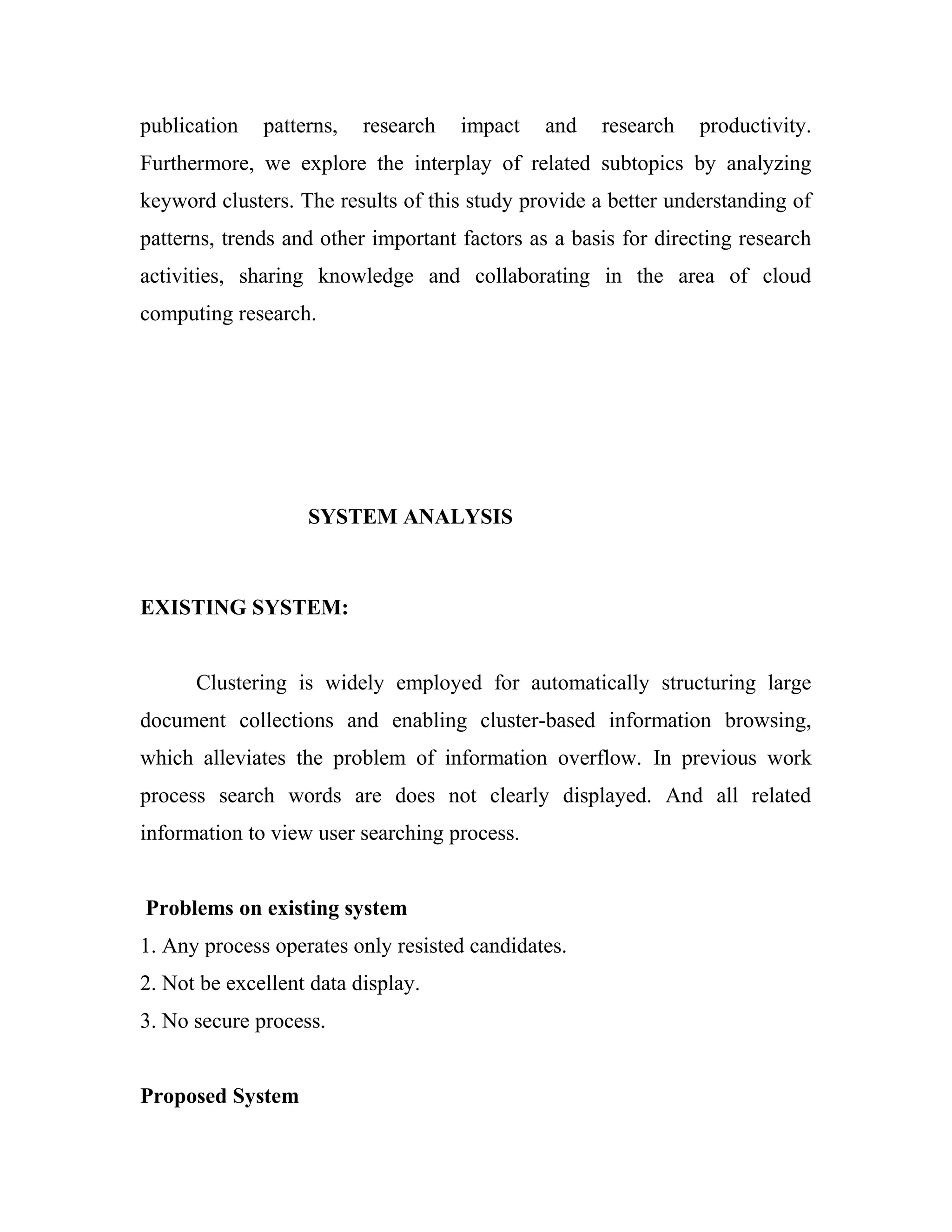 This document discusses a proposed system for improving the process of clustering and displaying search results from literature on cloud computing. The existing system has problems with only displaying results from registered candidates, poor data display, and lack of security. The proposed system aims to display the highest ranking search keywords based on user and publisher rankings to make the process more secure. It uses clustering to automatically organize documents by topic to improve information retrieval. The system would have administrative, publisher, search, and user modules and use ASP.Net and SQL Server software.