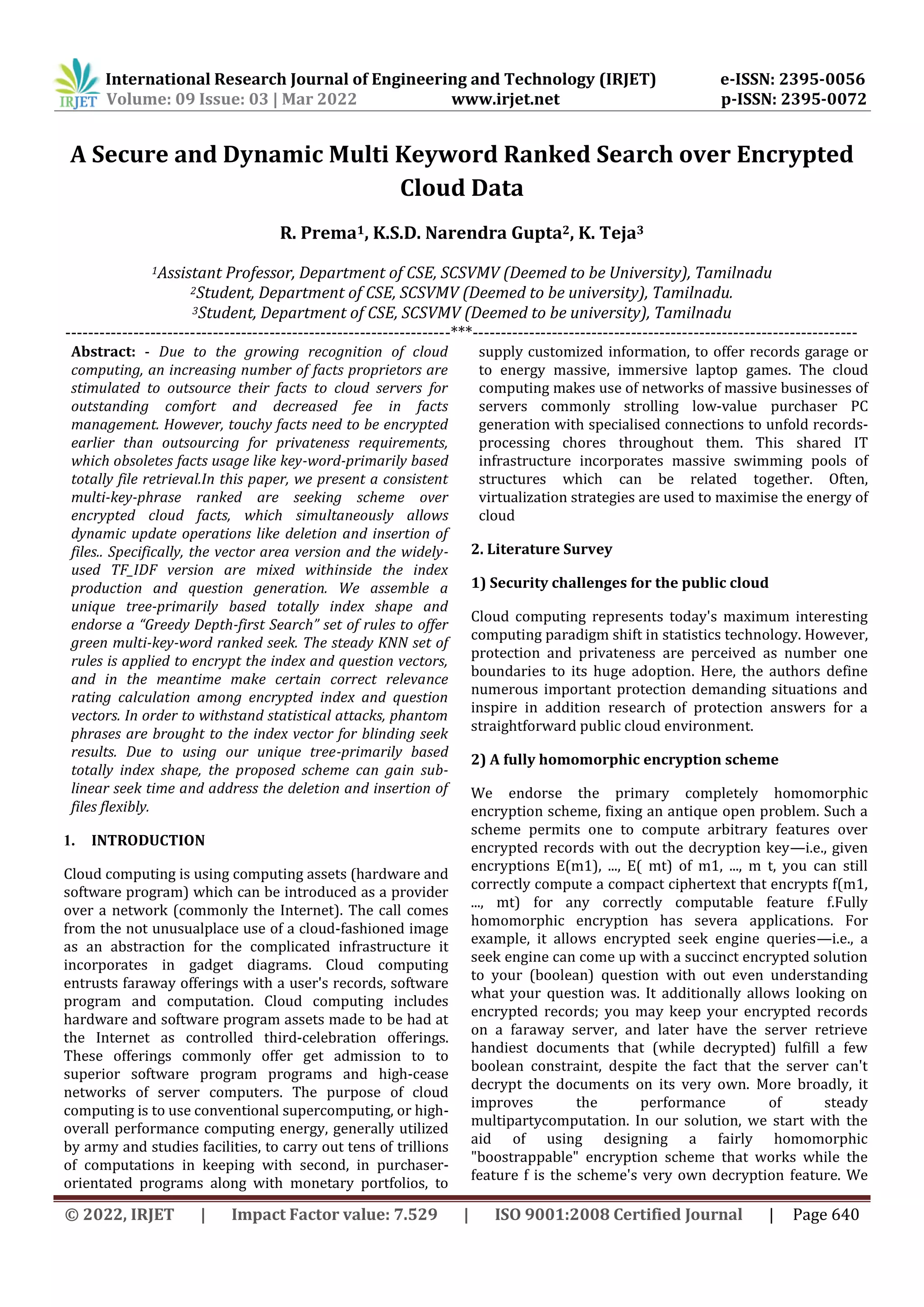 This document discusses a proposed scheme for secure and dynamic multi-keyword ranked search over encrypted cloud data. The scheme allows data owners to encrypt and outsource their data to the cloud while still enabling authorized users to perform keyword searches. It utilizes a tree-based index structure and "Greedy Depth-first Search" algorithm to provide efficient multi-keyword ranked search. The k-nearest neighbor algorithm is used to encrypt the index and query vectors while still allowing accurate relevance scoring of encrypted results. Phantom keywords are added to blind search results and prevent statistical attacks. The scheme also enables dynamic updates like deletion and insertion of files by the data owner. Experimental results demonstrate the performance of the proposed scheme.