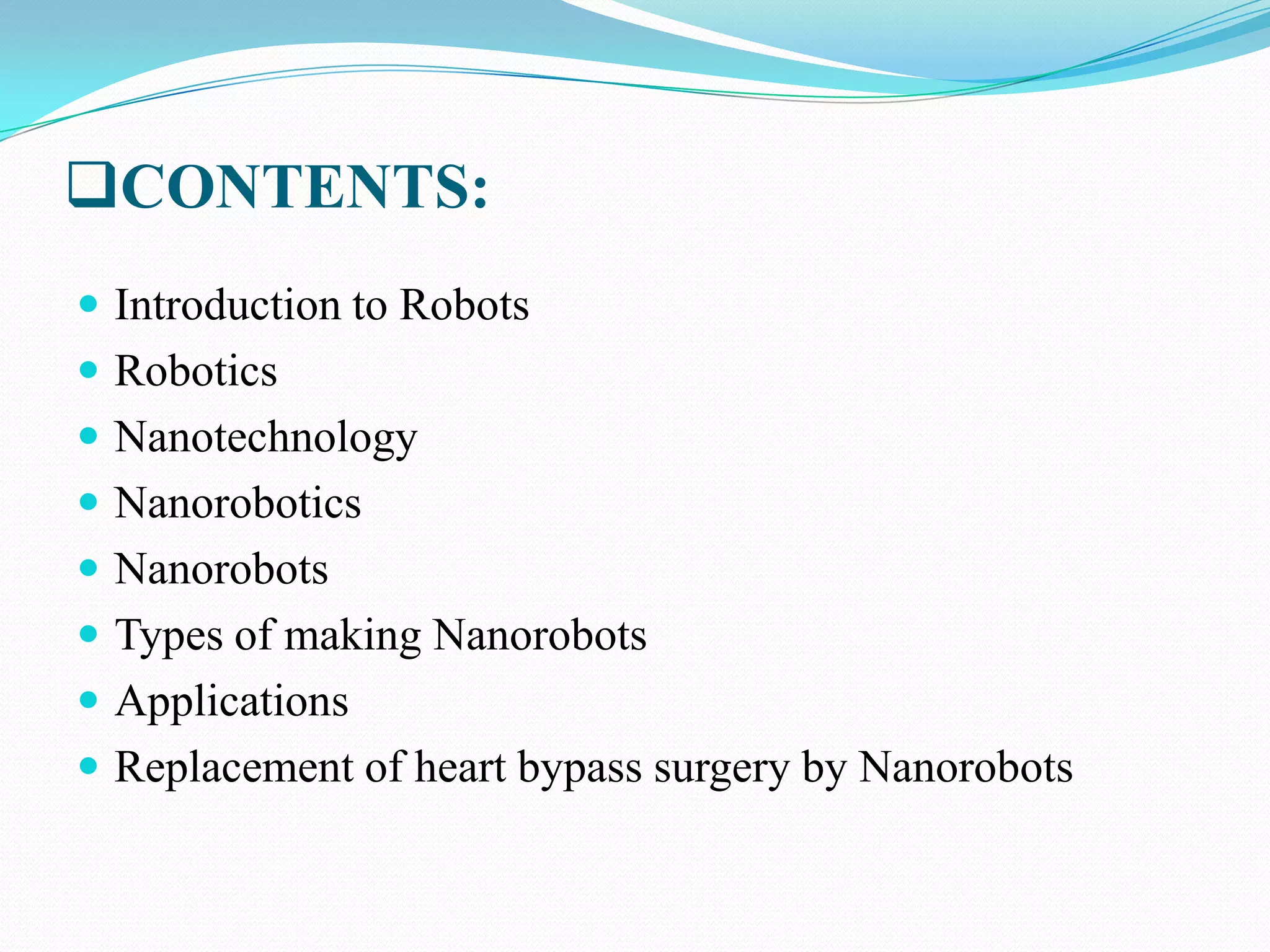 Nanorobotics is the emerging field of engineering nanorobots, which are robotic devices between 0.1-10 micrometers that are constructed of nanoscale or molecular components. Nanorobots could have applications in medicine such as performing surgery. One potential application is using a nanorobot to remove plaque from arteries and perform heart bypass surgery. The nanorobot would navigate through the bloodstream using sensors and propellers. It could identify plaque using temperature sensors and cameras. The nanorobot would then remove the plaque using a rotating needle. It would be powered by a nuclear power source and guided out of the body by surgery to remove it after completing the procedure. This could allow bypass surgery to be performed without major inc