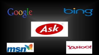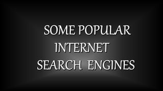 The document provides an overview of the internet including its history, development, connectivity techniques, uses and popular search engines. It describes how the internet began as a US Department of Defense project called ARPANET in 1957 and has evolved into a worldwide network. Key events included the development of TCP/IP protocols in 1973 allowing digital data transmission and the creation of the World Wide Web in 1991 by Tim Berners-Lee, improving accessibility of information on the internet. Popular services of the internet include email, file transfer, telecommunication and newsgroups while common uses are communication, information sharing and more.