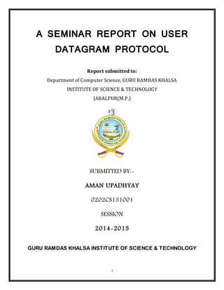 This document provides an overview of the User Datagram Protocol (UDP). It discusses UDP's attributes that make it suited for certain applications like streaming media. It describes UDP's packet structure including header fields like source/destination ports and checksum. It also compares UDP to the Transmission Control Protocol (TCP), noting that UDP does not guarantee delivery or ordering while TCP provides reliability. The document provides examples of applications that commonly use UDP like DNS and VoIP.