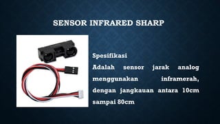 Dokumen ini membahas sensor jarak inframerah GP2D12 yang memiliki jangkauan antara 10cm hingga 80cm. Termasuk di dalamnya adalah petunjuk tentang cara mengunduh dan menginstal pustaka Arduino untuk penggunaan sensor. Terdapat juga instruksi mengenai penulisan kode untuk pengoperasian sensor tersebut.